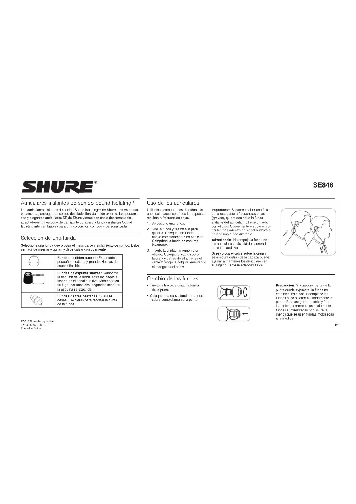 - Coloque una nueva funda para que cubra completamente la punta. Precaución: Si cualquier parte de la punta queda expuesta, la funda no está bien instalada. Reemplace las fundas si no sujetan ajustadamente la punta. Para asegurar un sello y func- ionamiento correctos, use solamente fundas suministradas por Shure (a menos que se usen fundas moldeadas a la medida). ©2015 Shure Incorporated 27EU23776 (Rev. 3) Printed in China16 Retiro de los auriculares Sujete el cuerpo del auricular y gírelo levemente para quitarlo. Nota: No tire del cable para retirar los auriculares. Cable desconectable Puede ser necesario desco- nectar el cable de los auricula- res para conectar componen- tes opcionales o para cambiar el cable si éste se daña. Para evitar la separación accidental, el conector tiene un calce ce- ñido. Tenga cuidado especial para impedir daño al auricular y al conector.