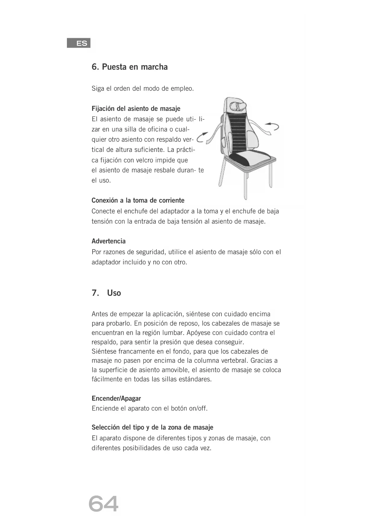 Siga el orden del modo de empleo. Fijación del asiento de masaje El asiento de masaje se puede uti- li- zar en una silla de oficina o cual- TXLHURWURDVLHQWRFRQUHVSDOGRYHU- tical de altura suficiente. La prácti- FDILMDFLöQFRQYHOFURLPSLGHTXH el asiento de masaje resbale duran- te el uso. Conexión a la toma de corriente &RQHFWHHOHQFKXIHGHODGDSWDGRUDODWRPD\HOHQFKXIHGHEDMD WHQVLöQFRQODHQWUDGDGHEDMDWHQVLöQDODVLHQWRGHPDVDMH Advertencia 3RUUD]RQHVGHVHJXULGDGXWLOLFHHODVLHQWRGHPDVDMHVöORFRQHO DGDSWDGRULQFOXLGR\QRFRQRWUR