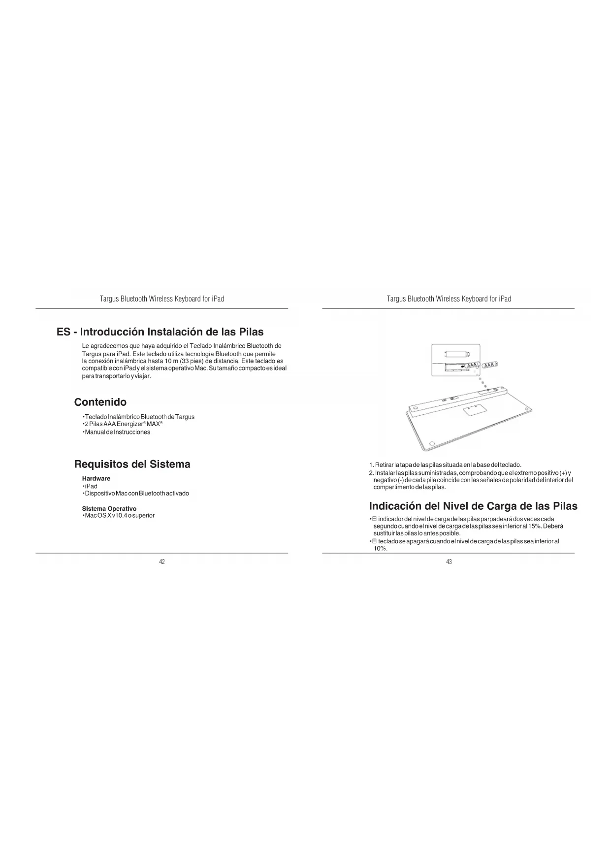 Función Pantalla InicialBuscariPad está en el modo de PortarretratosVer y ocultar el Teclado en la pantallaRetroceder o ir a la anterior canción, película o presentación de diapositivasAvanzar o ir a la siguiente canción, película o presentación de diapositivasReproducir o pausa en canciones, películas, o presentación de diapositivasCancelar el sonido del iPadDisminuir el volumen del iPadIncrementar el volumen del iPadBloquear la pantalla Conexión Bluetooth: Mac 1. Diríjase al icono Bluetooth situado en el escritorio o la barra del sistema y haga clic sobre el icono para iniciar la conguración. Seleccione “Turn Bluetooth On” (“Activar Bluetooth”) para activar la función Bluetooth del Mac. 2. Desplácese por la lista y seleccione “Set up Bluetooth Device...” (“Congurar el Dispositivo Bluetooth...”)3. El Asistente de Instalación del Bluetooth se activará. Siga las instrucciones de la pantalla.4. Seleccione “keyboard” (“teclado”) y haga clic en continuar para proseguir con la conguración. El teclado deberá estar en el modo “búsqueda” para conectarse.5. Pulse el botón Connect (Conexión) situado en la parte posterior del Teclado Inalámbrico Bluetooth de Targus para activar el modo búsqueda. La luz indicadora de baja carga parpadeará en azul cuando el teclado esté en el modo de búsqueda.6. El ordenador comenzará a buscar el teclado. Cuando encuentre el teclado, aparecerá indicado en la lista. Seleccione “Bluetooth Keyboard” (“Teclado Bluetooth”) y pulse continue (continuar). 7. El teclado Bluetooth iniciará la asociación. Haga clic en continue (continuar) para proseguir.8. Enhorabuena. El Teclado Bluetooth ya está congurado y listo para ser utilizado. Puede congurar otro dispositivo o hacer clic en Quit (Salir) para abandonar la conguración.Targus Bluetooth Wireless Keyboard for iPad