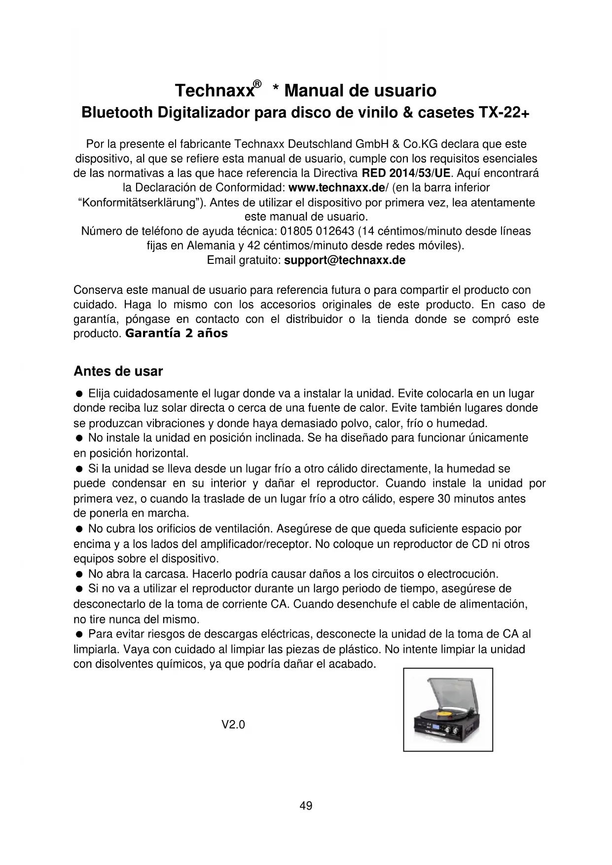 - Manual de usuario Bluetooth Digitalizador para disco de vinilo & casetes TX-22+ Por la presente el fabricante Technaxx Deutschland GmbH & Co.KG declara que este dispositivo, al que se refiere esta manual de usuario, cumple con los requisitos esenciales de las normativas a las que hace referencia la Directiva RED 2014/53/UE. Aquí encontrará la Declaración de Conformidad: www.technaxx.de/ (en la barra inferior “Konformitätserklärung”). Antes de utilizar el dispositivo por primera vez, lea atentamente este manual de usuario. Número de teléfono de ayuda técnica: 01805 012643 (14 céntimos/minuto desde líneas fijas en Alemania y 42 céntimos/minuto desde redes móviles). Email gratuito: support@technaxx.de Conserva este manual de usuario para referencia futura o para compartir el producto con cuidado. Haga lo mismo con los accesorios originales de este producto. En caso de garantía, póngase en contacto con el distribuidor o la tienda donde se compró este producto. Garantía 2 años Antes de usar Elija cuidadosamente el lugar donde va a instalar la unidad. Evite colocarla en un lugar donde reciba luz solar directa o cerca de una fuente de calor. Evite también lugares donde se produzcan vibraciones y donde haya demasiado polvo, calor, frío o humedad. No instale la unidad en posición inclinada. Se ha diseñado para funcionar únicamente en posición horizontal. Si la unidad se lleva desde un lugar frío a otro cálido directamente, la humedad se puede condensar en su interior y dañar el reproductor. Cuando instale la unidad por primera vez, o cuando la traslade de un lugar frío a otro cálido, espere 30 minutos antes de ponerla en marcha. No cubra los orificios de ventilación. Asegúrese de que queda suficiente espacio por encima y a los lados del amplificador/receptor. No coloque un reproductor de CD ni otros equipos sobre el dispositivo. No abra la carcasa. Hacerlo podría causar daños a los circuitos o electrocución. Si no va a utilizar el reproductor durante un largo periodo de tiempo, asegúrese de desconectarlo de la toma de corriente CA. Cuando desenchufe el cable de alimentación, no tire nunca del mismo. Para evitar riesgos de descargas eléctricas, desconecte la unidad de la toma de CA al limpiarla. Vaya con cuidado al limpiar las piezas de plástico. No intente limpiar la unidad con disolventes químicos, ya que podría dañar el acabado.