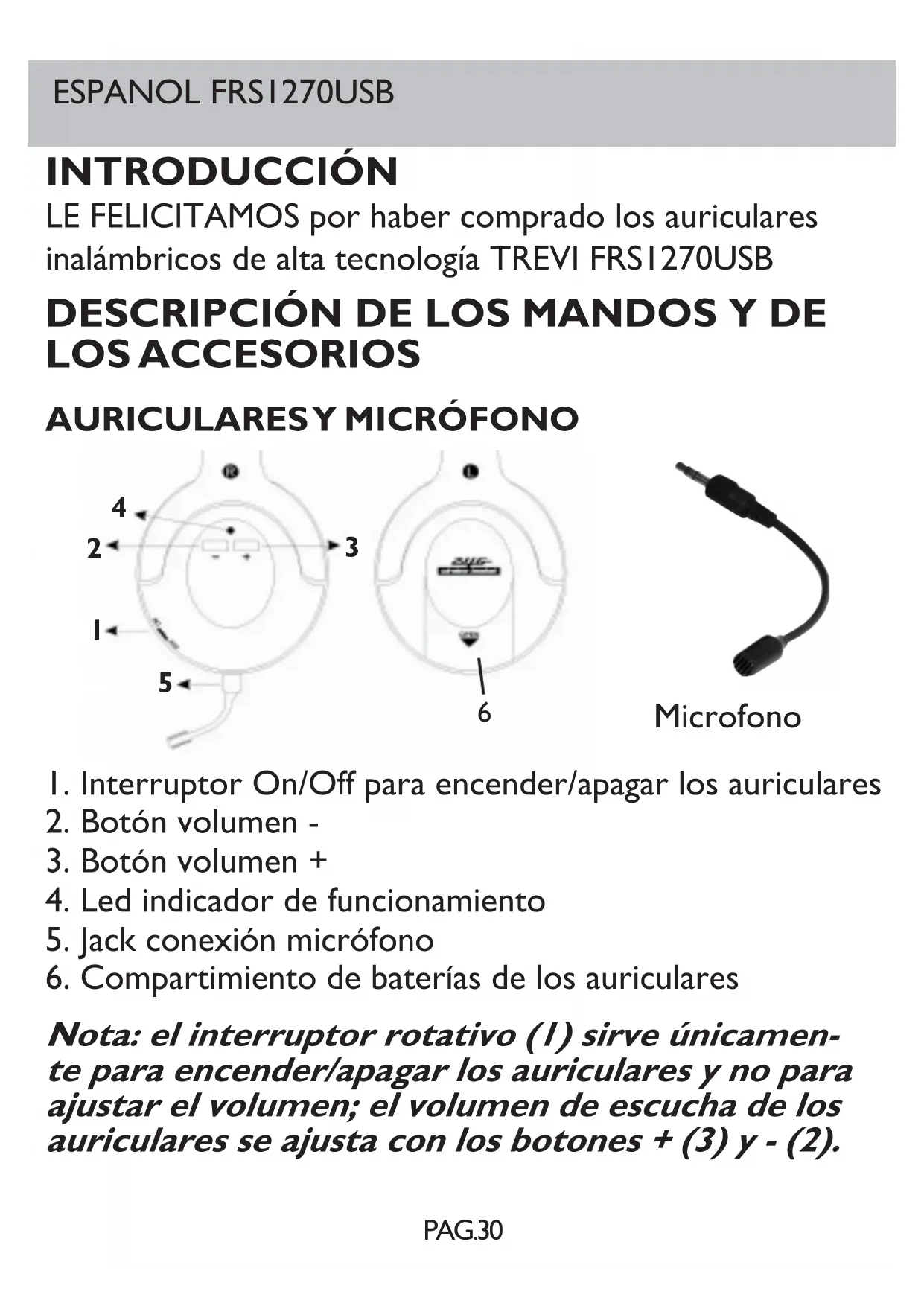 dongle USB. $MXVWHGHOYROXPHQ: el volumen de escucha de los auriculares se SXHGHDMXVWDUFRQORVERWRQHV\DOSXOVDUUHSHWLGDPHQWHHO ERWyQVXEHHOQLYHOGHHVFXFKD\DOSUHVLRQDUUHSHWLGDPHQWHHO ERWyQEDMD Uso del micrófono: los auriculares FRS1270USB se pueden usar con ORVPiVFRQRFLGRVSURJUDPDVGHFRPXQLFDFLyQGHYtGHR&RQHFWHHO PLFUyIRQRVXPLQLVWUDGRHQHOMDFNVLWXDGRDOODGRGHOLQWHUUXSWRU rotativo de encendido (1). Una vez efectuado el procedimiento de uso GHORVDXULFXODUHVHOPLFUyIRQRHVWiDFWLYR\VHSXHGHFRPHQ]DUOD FRQYHUVDFLyQPHGLDQWHORVGLIHUHQWHVVRIWZDUHGHYtGHROODPDGDSDUD FRQRFHUORVSURFHGLPLHQWRVVREUHFyPRHIHFWXDUXQDYtGHROODPDGD consulte las instrucciones del software utilizado). NotaSDUDXQDEXHQDUHFHSFLyQGHOPLFUyIRQRPDQWpQJDORDXQRV cm de la boca.ESPANOL FRS1270USB 3$* Función standby: para proteger el consumo de las baterías, los auriculares FRS1270USB poseen un circuito que los coloca en modo