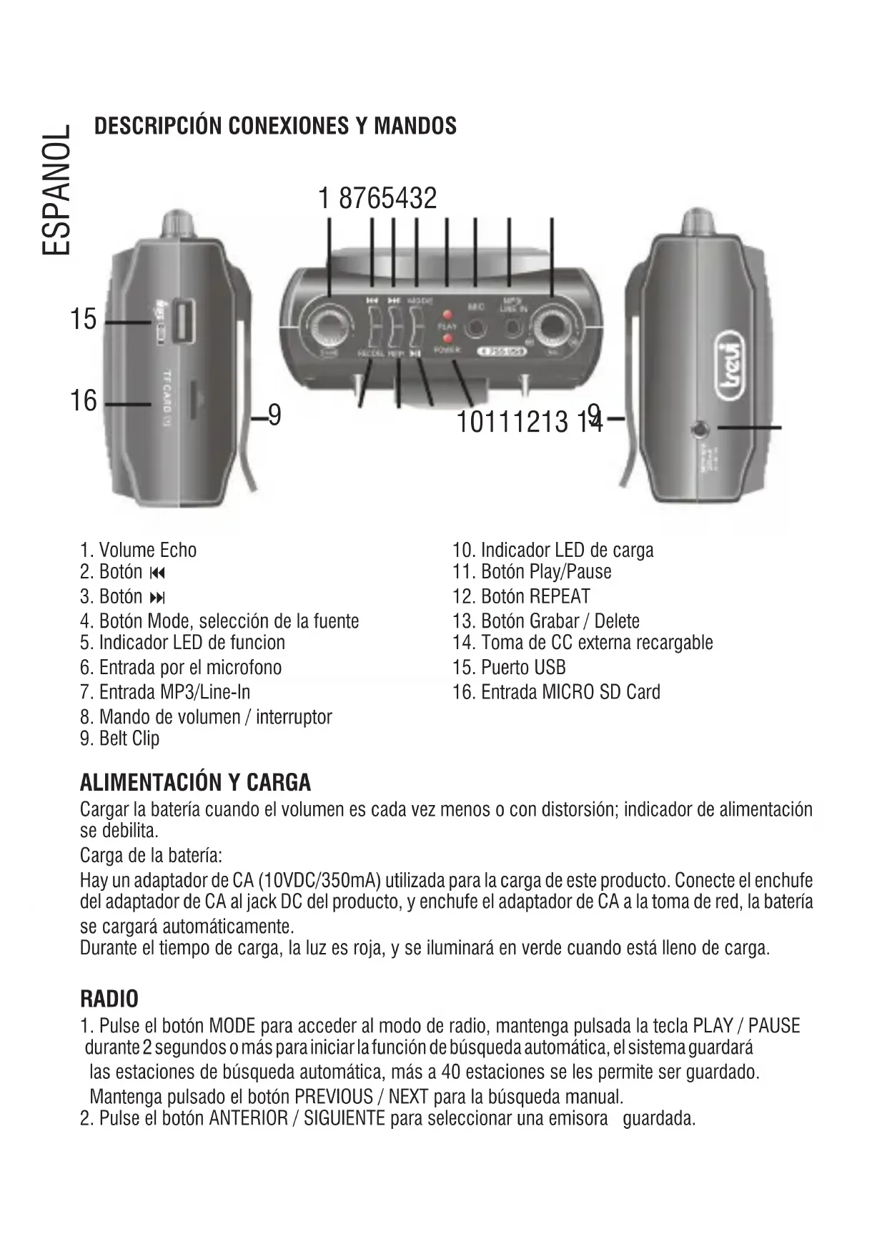 Banda de frecuencias: .......................................................................... FM 87.5-108.0MHz Alimentación: ..................................................... Batería de litio recargable 7.4V 1300mAh Cargador: ....................................... Entrada CA 100-240 50/60Hz - Salida DC10V 350 mA Dimensiones: ...........................................................................................115x100x50 mm ADVERTENCIA PARA LA CORRECTA UTILIZACIÓN DE LA BATERÍA RECARGABLE - recargue la batería a una temperatura de entre 5°C y 35°C. - no cargue la batería más del tiempo indicado para evitar riesgos de explosión o sobrecalentamiento. - no cargue la batería durante más de 6 horas. - un tiempo de recarga superior al tiempo indicado o un período prolongado de inactividad pueden reducir la duración de la batería. - la batería recargable está sujeta a desgaste y su capacidad disminuye gradualmente. - para prolongar la duración de la batería, utilícela cuando está totalmente cargada hasta agotarla por completo. Cárguela completamente de nuevo antes de volver a utilizarla. Si se carga una batería no completamente agotada, se reduce su duración. En ese caso, repita el ciclo de carga/descarga completa más veces. - Evite cargar la batería durante toda la noche. NOTAS SOBRE LA EXTRACCIÓN Y ELIMINACIÓN DE LAS BATERÍAS ¡Atención, la operación de extracción y eliminación debe ser realizada exclusivamente por personal técnico especializado!