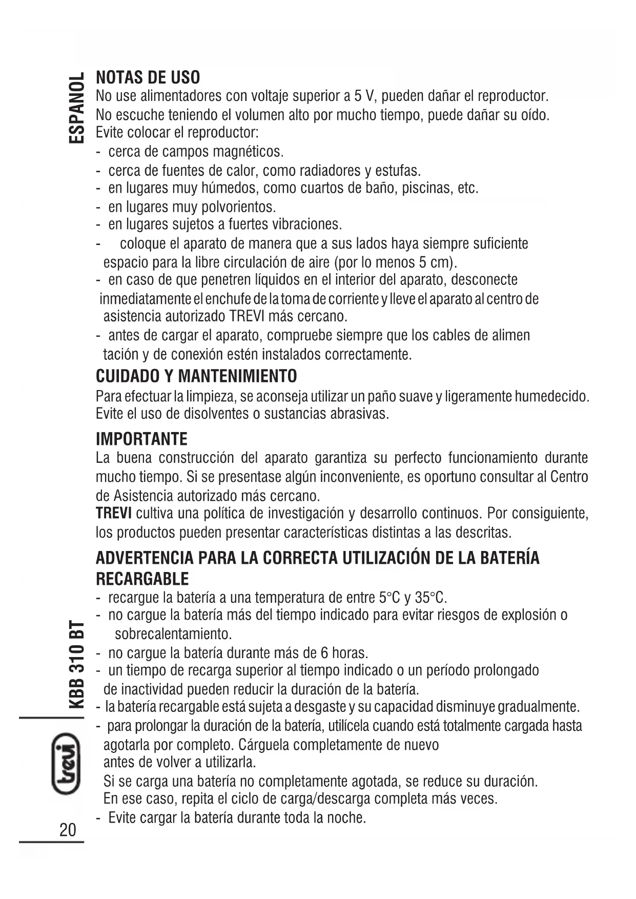 Para efectuar la limpieza, se aconseja utilizar un paño suave y ligeramente humedecido. Evite el uso de disolventes o sustancias abrasivas. IMPORTANTE La buena construcción del aparato garantiza su perfecto funcionamiento durante mucho tiempo. Si se presentase algún inconveniente, es oportuno consultar al Centro de Asistencia autorizado más cercano. TREVI cultiva una política de investigación y desarrollo continuos. Por consiguiente, los productos pueden presentar características distintas a las descritas. ADVERTENCIA PARA LA CORRECTA UTILIZACIÓN DE LA BATERÍA RECARGABLE - recargue la batería a una temperatura de entre 5°C y 35°C. - no cargue la batería más del tiempo indicado para evitar riesgos de explosión o sobrecalentamiento. - no cargue la batería durante más de 6 horas. - un tiempo de recarga superior al tiempo indicado o un período prolongado de inactividad pueden reducir la duración de la batería. - la batería recargable está sujeta a desgaste y su capacidad disminuye gradualmente. - para prolongar la duración de la batería, utilícela cuando está totalmente cargada hasta agotarla por completo. Cárguela completamente de nuevo antes de volver a utilizarla. Si se carga una batería no completamente agotada, se reduce su duración. En ese caso, repita el ciclo de carga/descarga completa más veces. - Evite cargar la batería durante toda la noche. ESPANOLKBB 310 BT