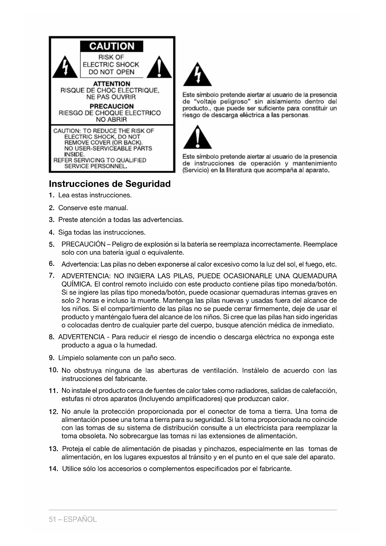 PRECAUCIÓN – Peligro de explosión si la batería se reemplaza incorrectamente. Reemplace solo con una batería igual o equivalente.