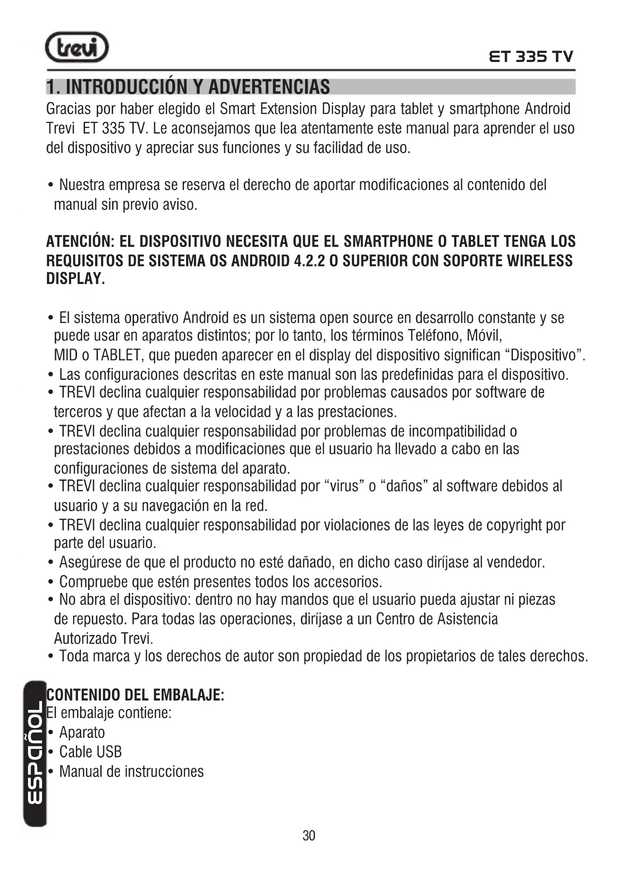 Gracias por habereggido el Smart Extension Display para tablet y smartphone Android Trevi ET 335 TV. Le acontejos que lea atentamente este manual para'auder el uso del dispositivo y disfrueir sus functions y su calidad de uso.