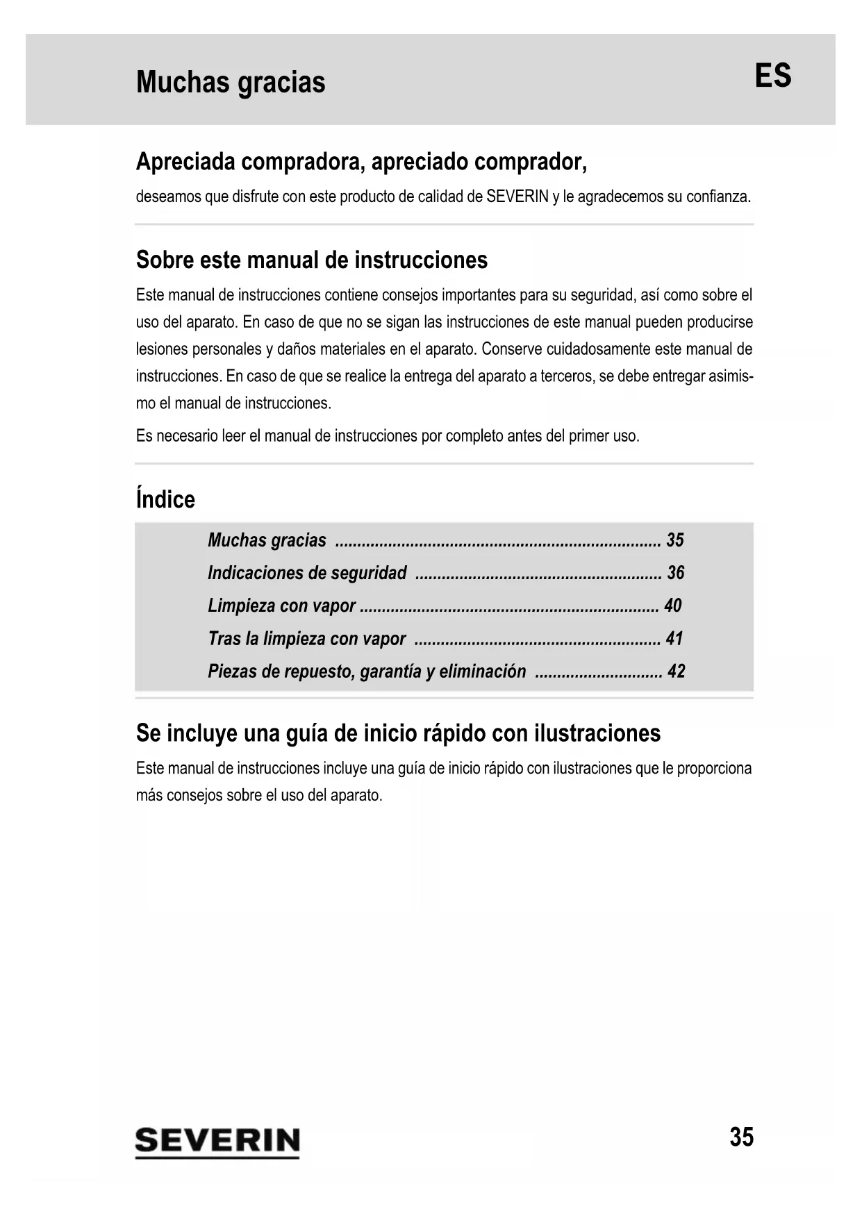 - de limpieza o lávelo como máx. a 60 °C. No utilice suavizante. No use lejía. No use secadora. Guía de inicio rápido con ilustraciones (página 3). Limpieza del aparato – Antes de limpiar el aparato, apague el aparato y desenchufe el conector de la toma de corriente. – La carcasa y el cable no deben ser manipulados con líquidos ni sumergidos en ellos por moti- vos de seguridad eléctrica. La carcasa se debe limpiar pasando un trapo ligeramente húmedo y después se debe secar frotando. – Para la limpieza no deben utilizarse detergentes agresivos ni abrasivos o cepillos duros. Solución de problemas Para que no se produzcan problemas, es importante utilizar el aparato conforme a estas instrucciones. Si continúa teniendo problemas con el aparato, consulte primero en Inter- net www.severin.com/go/to/8367 en "FAQ" e intente solucionar el pro- blema por su cuenta. Por medio de este código QR puede acceder directamente a nuestra pá- gina web. Si esto no le ayuda, diríjase a nuestro servicio de atención al cliente. Puede encontrar los datos de contacto en el anexo de este manual de instrucciones. ST 7181.book Seite 41 Dienstag, 22. Juli 2014 4:17 1642 Piezas de repuesto, garantía y eliminación 5 Piezas de repuesto, ga rantía y eliminación Pedido de piezas de repuesto y accesorios Puede pedir cómodamente piezas de repuesto o accesorios en Internet en nuestra página web www.severin.com/go/to/8367 en el menú "Servicio técnico/tienda de repuestos". Nuestro juego de 5 unidades de limpieza (compuesto por 4 paños de lim- pieza de microfibra y 1 suela deslizante para moquetas) se puede pedir con el número de referencia 8243048 en la página web o a través de nues- tro servicio de atención al cliente. Por medio de este código QR puede acceder directamente a nuestra pá- gina web. Garantía Las siguientes condiciones de garantía no afectan a los derechos de garantía legal frente al vende- dor y a otras posibles garantías del vendedor. Si resulta necesaria una reparación, póngase en contacto con nuestro servicio de atención al cliente por teléfono o por correo electrónico. Puede encontrar los datos de contacto en el anexo de este manual de instrucciones. En caso de garantía, también puede dirigirse directa- mente al distribuidor. Además, SEVERIN concede una garantía de fabricantes de dos años a partir de la fecha de la compra. Durante ese plazo de tiempo eliminaremos de forma gratuita cualquier deficiencia que pueda demostrarse que se debe a un fallo de material o de fabricación e impida un funcionamiento normal. Queda excluido cualquier otro derecho de reclamación. Quedan excluidos de la garantía: Los daños que se deban a la inobservancia del manual de ins- trucciones, la manipulación incorrecta o el desgaste normal, así como los referidos a piezas frágiles como cristal, plástico o bombillas. La garantía se extingue en caso de intervención por parte de ins- tancias no autorizadas por SEVERIN. Eliminación Los aparatos identificados con este símbolo deben eliminarse por separado de la basura doméstica. Los aparatos contienen materia prima valiosa que puede reutili- zarse. Una eliminación de residuos correcta protege el medio ambiente y la salud de sus congéneres. La administración municipal o su distribuidor especializado le proporcionarán información sobre la eliminación de desechos adecuada. ST 7181.book Seite 42 Dienstag, 22. Juli 2014 4:17 1643 Grazie 1Grazie Gentile cliente, grazie per la fiducia accordataci. Ci auguriamo che possa apprezzare appieno questo prodotto di qualità SEVERIN. Informazioni sulle presenti istruzioni per l'uso Le istruzioni per l'uso contengono importanti suggerimenti per la Sua sicurezza e per l'uso dell'ap- parecchio. Il mancato rispetto delle istruzioni per l'uso può causare lesioni alle persone o danni all'apparecchio. Conservare con cura le istruzioni per l'uso. Nel caso di cessione dell'apparecchio a terzi, consegnare anche le istruzioni per l'uso. Leggere attentamente tutte le istruzioni per l'uso precedentemente al primo uso. Indice Grazie p. 43