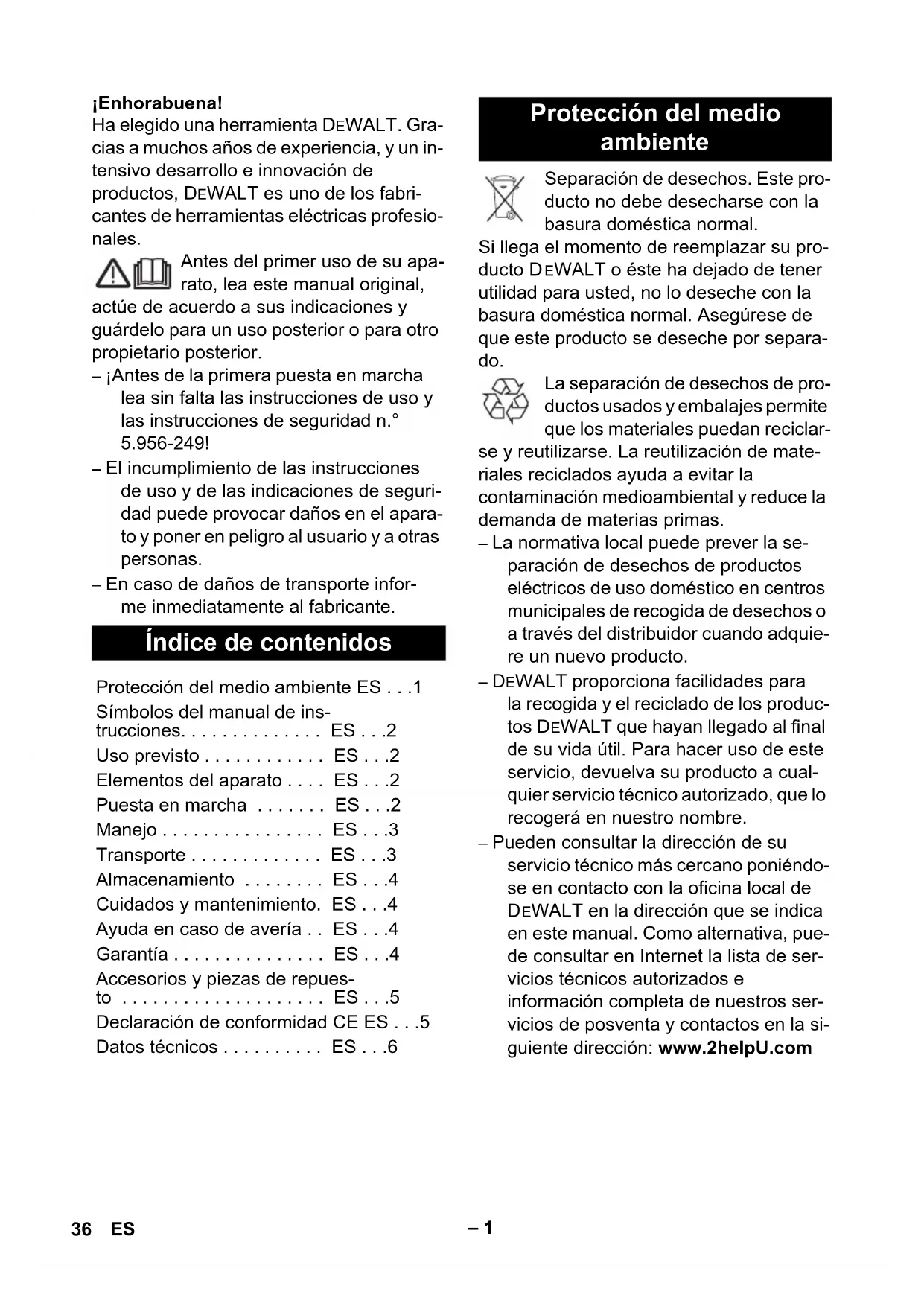dimiento de su herramienta D EWALT, sólo tiene que devolverla completa, tal y como