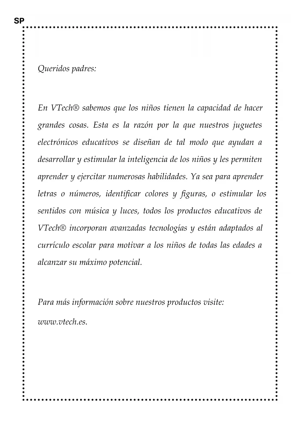 EXENCIÓN DE RESPONSABILIDAD VTech Electronics y sus distribuidores no se hacen responsables de las