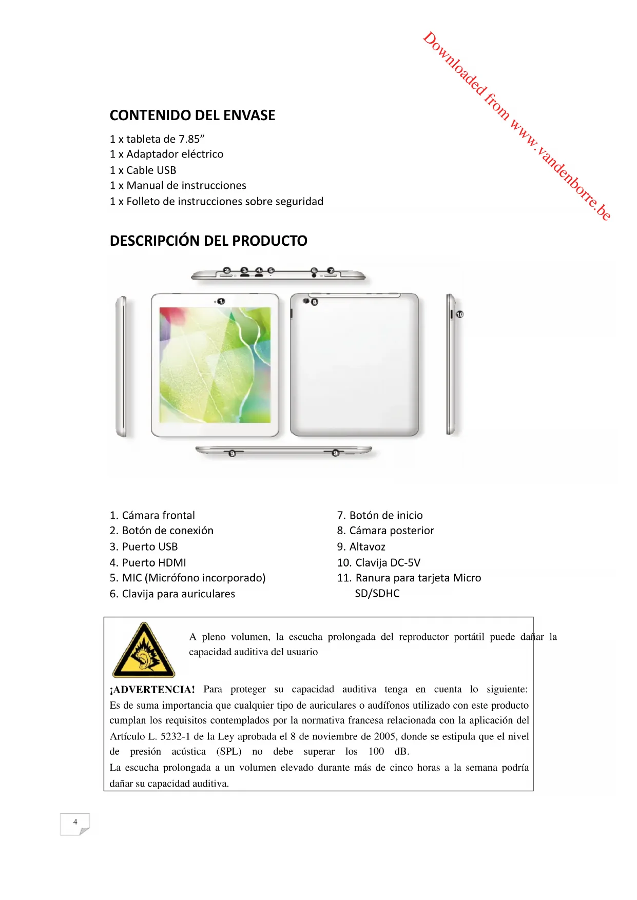 ¡ADVERTENCIA! Para proteger su capacidad auditiva tenga en cuenta lo siguiente: Es de suma importancia que cualquier tipo de auriculares o audífonos utilizado con este producto cumplan los requisitos contemplados por la normativa francesa relacionada con la aplicación del Artículo L. 5232-1 de la Ley aprobada el 8 de noviembre de 2005, donde se estipula que el nivel de presión acústica (SPL) no debe superar los 100 dB. La escucha prolongada a un volumen elevado durante más de cinco horas a la semana podría dañar su capacidad auditiva. A pleno volumen, la escucha prolongada del reproductor portátil puede dañar la capacidad auditiva del usuario Downloaded from www.vandenborre.be5 A fin de prevenir posibles lesiones auditivas, no escuche a niveles de volumen elevados por largos periodos de tiempo.