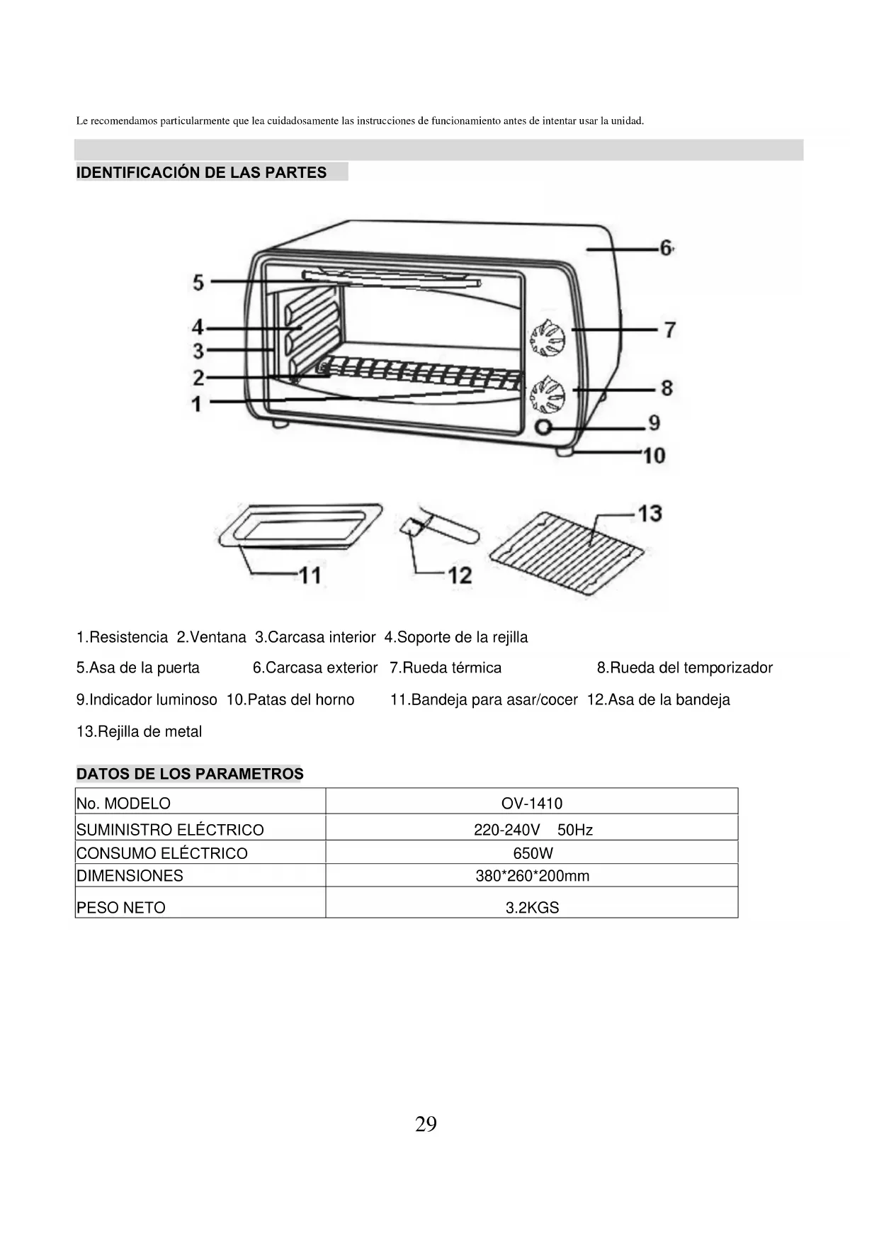 1.Resistencia 2.Ventana 3.Carcasa interior 4.Soporte de la rejilla 5.Asa de la puerta 6.Carcasa exterior 7.Rueda térmica 8.Rueda del temporizador 9.Indicador luminoso 10.Patas del horno