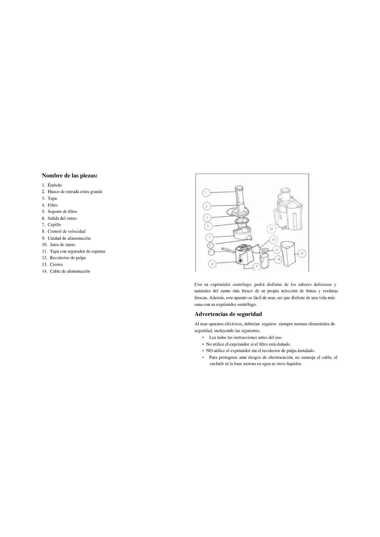 Con su exprimidor centrífugo, podrá disfrutar de los sabores deliciosos y naturales del zumo más fresco de su propia selección de frutas y verduras frescas. Además, este aparato es fácil de usar, así que disfrute de una vida más sana con su exprimidor centrífugo. Advertencias de seguridad Al usar aparatos eléctricos, deberían seguirse siempre normas elementales de seguridad, incluyendo las siguientes.