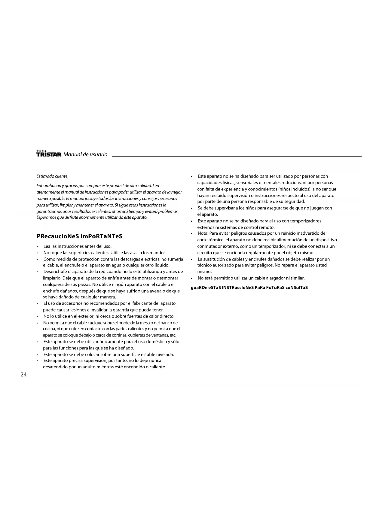 - No está permitido utilizar un cable alargador ni similar. guaRDe eSTaS INSTRuccIoNeS PaRa FuTuRaS coNSulTaS Manual de usuario1