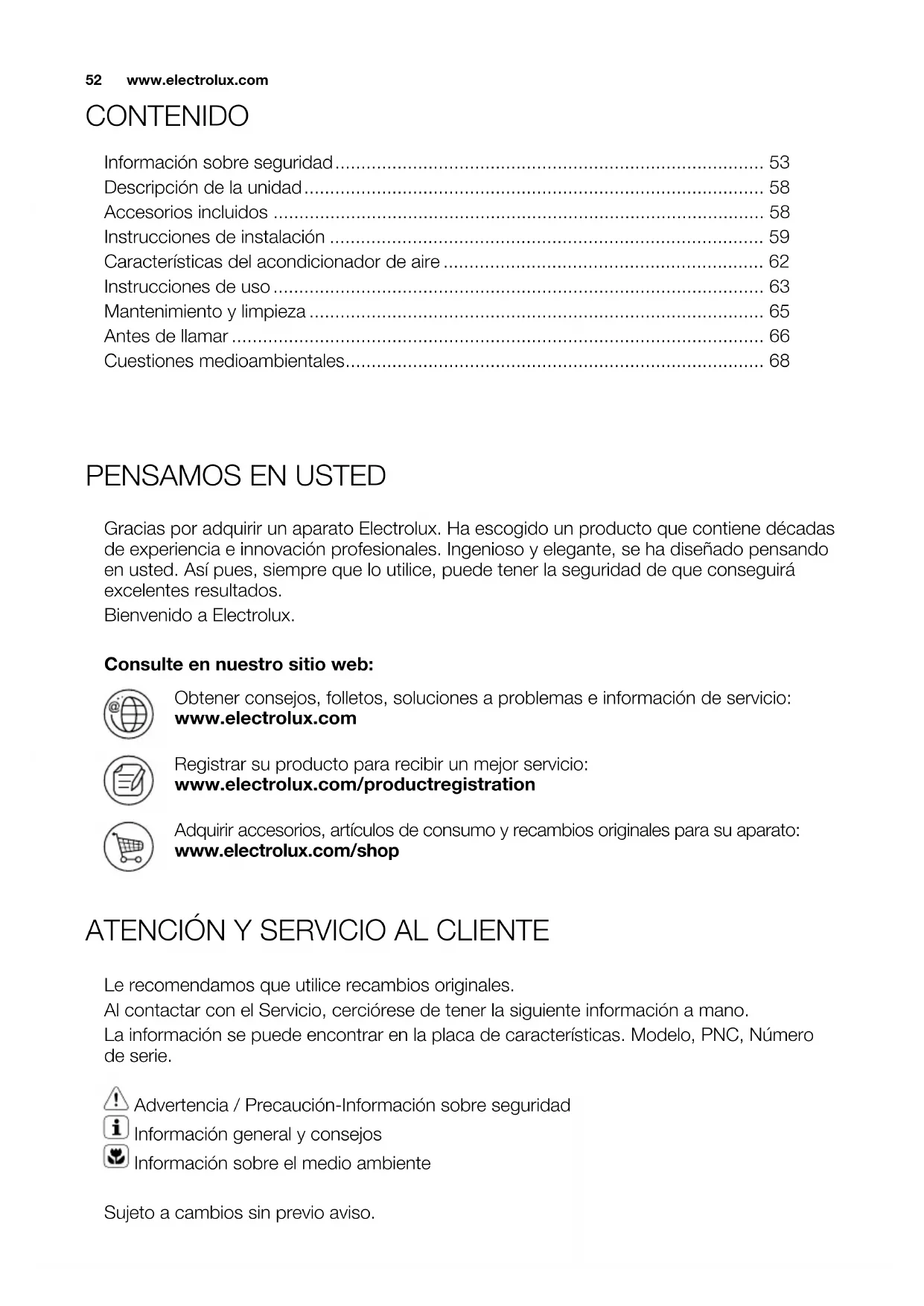 CONTENIDO PENSAMOS EN USTED Gracias por adquirir un aparato Electrolux. Ha escogido un producto que contiene décadas
