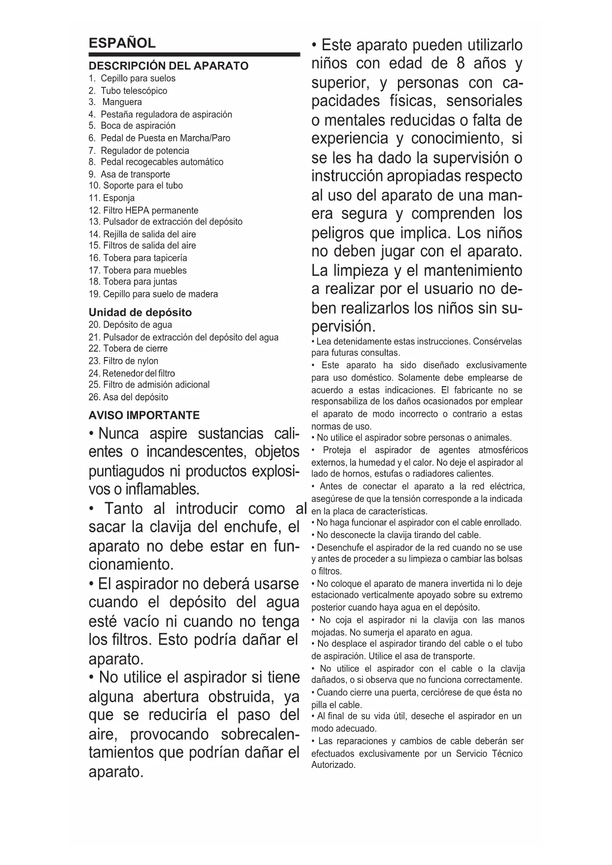 - El aspirador nunca debe encenderse sin que los