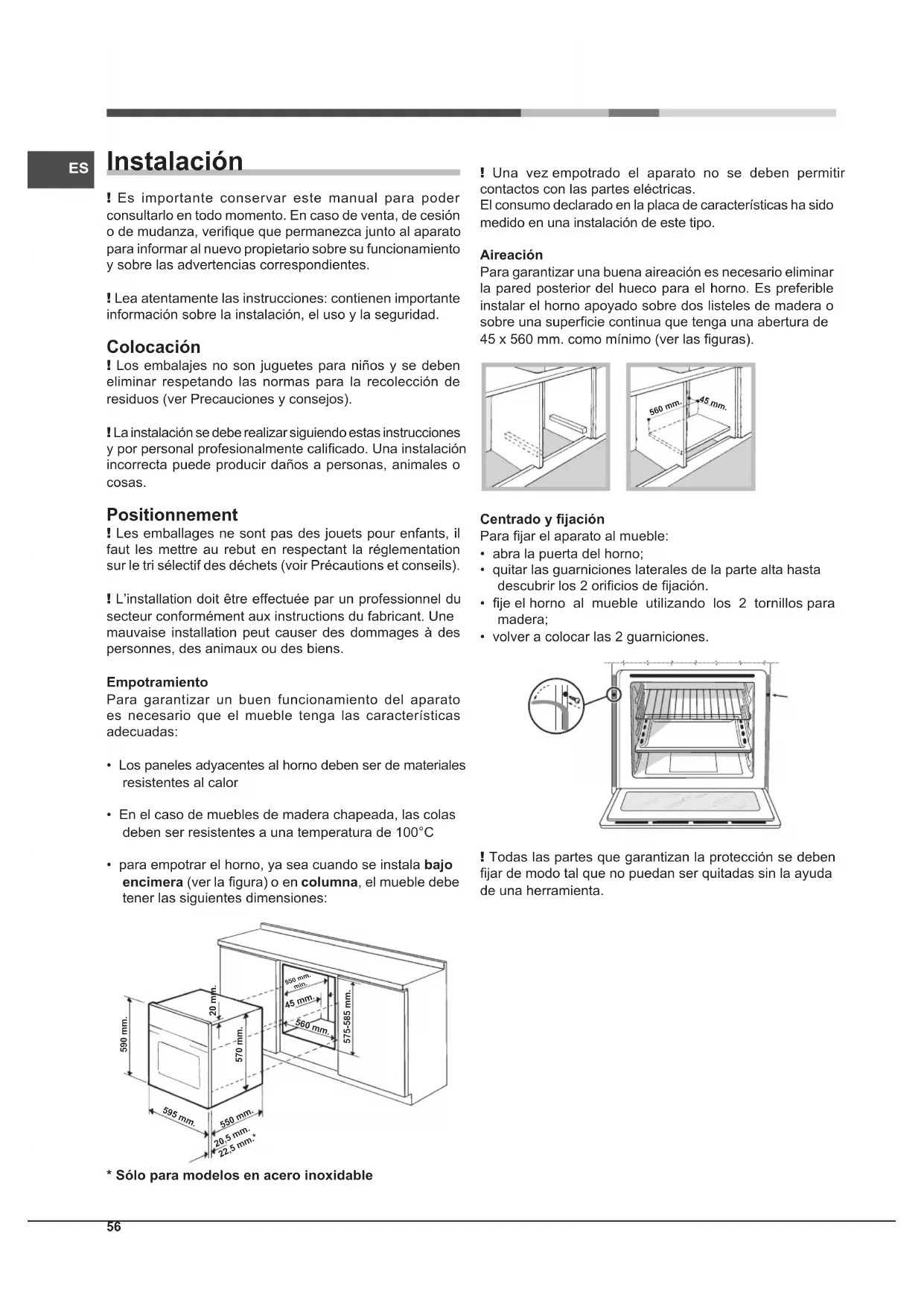 Instalación ! Es importante conservar este manual para poder consultarlo en todo momento. En caso de venta, de cesión o de mudanza, verique que permanezca junto al aparato para informar al nuevo propietario sobre su funcionamiento y sobre las advertencias correspondientes. ! Lea atentamente las instrucciones: contienen importante información sobre la instalación, el uso y la seguridad. Colocación ! Los embalajes no son juguetes para niños y se deben eliminar respetando las normas para la recolección de residuos (ver Precauciones y consejos). ! La instalación se debe realizar siguiendo estas instrucciones y por personal profesionalmente calicado. Una instalación incorrecta puede producir daños a personas, animales o cosas. Positionnement ! Les emballages ne sont pas des jouets pour enfants, il faut les mettre au rebut en respectant la réglementation sur le tri sélectif des déchets (voir Précautions et conseils). ! L’installation doit être effectuée par un professionnel du secteur conformément aux instructions du fabricant. Une mauvaise installation peut causer des dommages à des personnes, des animaux ou des biens. Empotramiento Para garantizar un buen funcionamiento del aparato es necesario que el mueble tenga las características adecuadas: