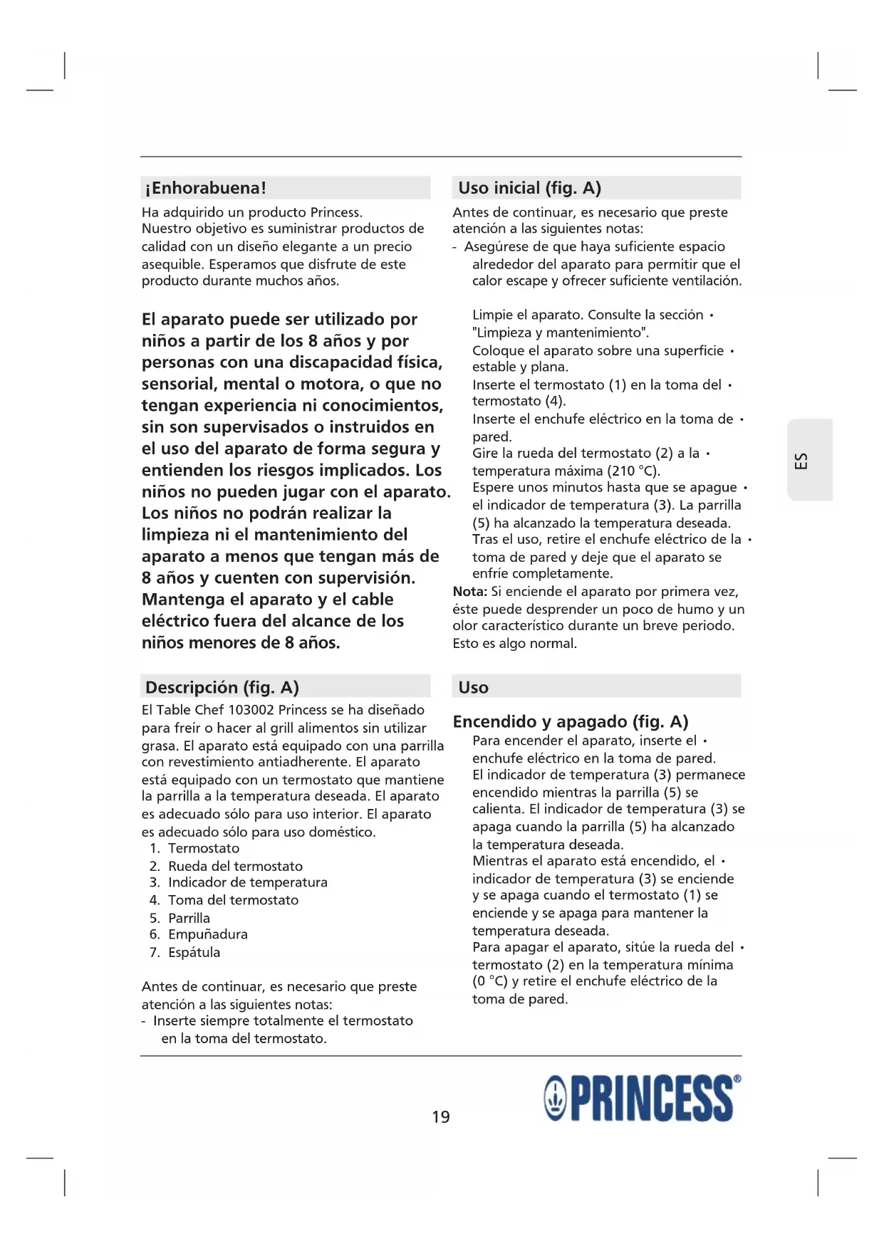 ¡Enhorabuena! Ha adquirido un producto Princess. Nuestro objetivo es suministrar productos de calidad con un diseño elegante a un precio asequible. Esperamos que disfrute de este producto durante muchos años. El aparato puede ser utilizado por niños a partir de los 8 años y por personas con una discapacidad física, sensorial, mental o motora, o que no tengan experiencia ni conocimientos, sin son supervisados o instruidos en el uso del aparato de forma segura y entienden los riesgos implicados. Los niños no pueden jugar con el aparato. Los niños no podrán realizar la limpieza ni el mantenimiento del aparato a menos que tengan más de 8 años y cuenten con supervisión. Mantenga el aparato y el cable eléctrico fuera del alcance de los niños menores de 8 años. Descripción (fig. A) El Table Chef 103002 Princess se ha diseñado para freír o hacer al grill alimentos sin utilizar grasa. El aparato está equipado con una parrilla con revestimiento antiadherente. El aparato está equipado con un termostato que mantiene la parrilla a la temperatura deseada. El aparato es adecuado sólo para uso interior. El aparato es adecuado sólo para uso doméstico.