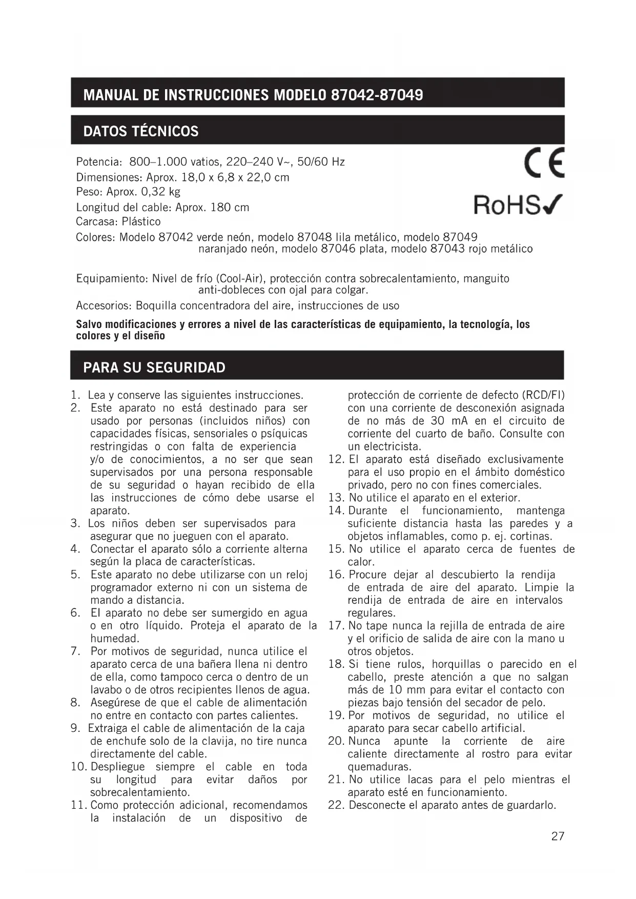 MANUAL DE INSTRUCCIONES MODELO 87042-87049