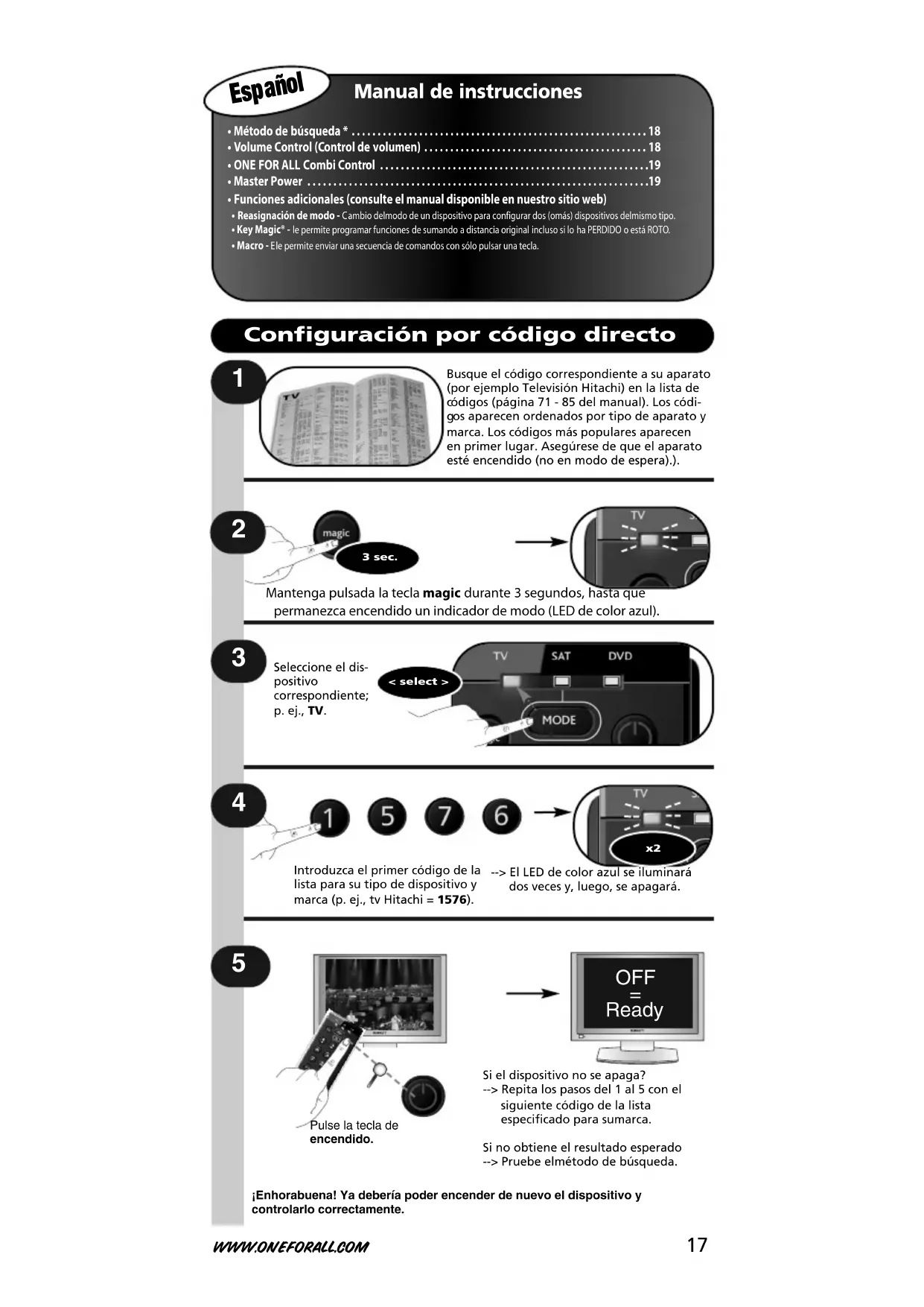 Configuración por código directo Pulse la tecla deencendido.¡Enhorabuena! Ya debería poder encender de nuevo el dispositivo ycontrolarlo correctamente.WWW.ONEFORALL.COM