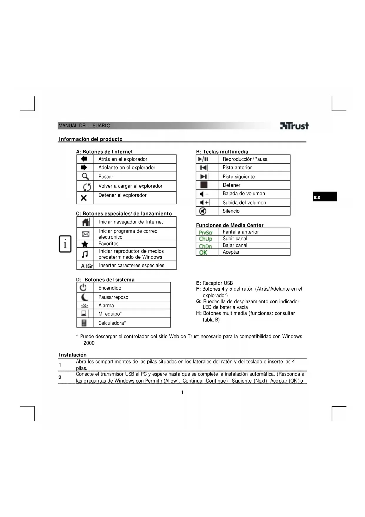E: Receptor USB F: Botones 4 y 5 del ratón (Atrás/Adelante en el explorador) G: Ruedecilla de desplazamiento con indicador LED de batería vacía H: Botones multimedia (funciones: consultar tabla B)