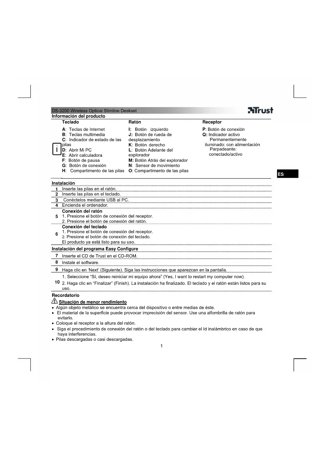 - Se prohíbe la reproducción total o parcial de este manual sin la autorización de Trust International B.V.DS-3200 Wireless Optical Slimline Deskset