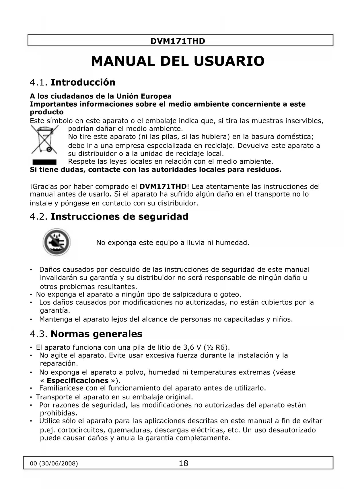 4.1. Introducción A los ciudadanos de la Unión Europea Importantes informaciones sobre el medio ambiente concerniente a este producto Este símbolo en este aparato o el embalaje indica que, si tira las muestras inservibles, podrían dañar el medio ambiente. No tire este aparato (ni las pilas, si las hubiera) en la basura doméstica; debe ir a una empresa especializada en reciclaje. Devuelva este aparato a su distribuidor o a la unidad de reciclaje local. Respete las leyes locales en relación con el medio ambiente. Si tiene dudas, contacte con las autoridades locales para residuos. ¡Gracias por haber comprado el DVM171THD! Lea atentamente las instrucciones del manual antes de usarlo. Si el aparato ha sufrido algún daño en el transporte no lo instale y póngase en contacto con su distribuidor. 4.2. Instrucciones de seguridad No exponga este equipo a lluvia ni humedad.