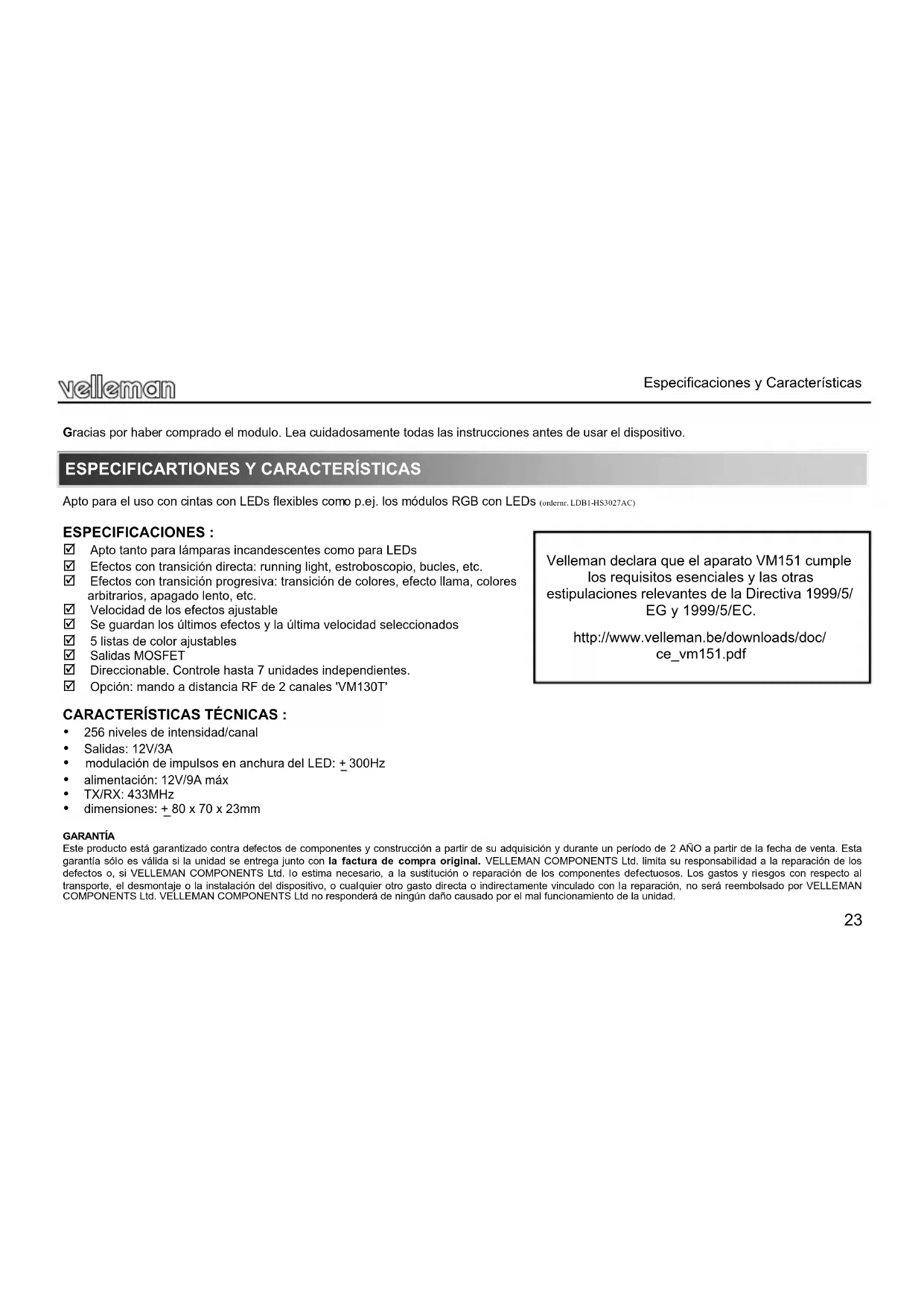 Este producto esta garrizado contra defectos de componentes y construccion a partir de su adquision y durante un periodo de 2 ANO a partir de la fecha de venta. Esta garantia sio es validi si la unidad se entega junto con la factura de compra original. VELLEMAN COMPONENTS Ltd. limita su responsabilitad a la reparacion de los defectos o, si VELLEMAN COMPONENTS Ltd. lo estima necessario, a la sustitulc i or reparacion de los componentes defectuos. Los gastos y riesgos con respecto al transporte, el desmontaje o la instalacion del dispositivo, o qualier other gastro directa o indirectamente vinculado con la reparacion, no sera rembolsado por VELLEMAN COMPONENTS Ltd. VELLEMAN COMPONENTS Ltd no respondera de ningun daño causado por el mal funcnamento de la unidad.