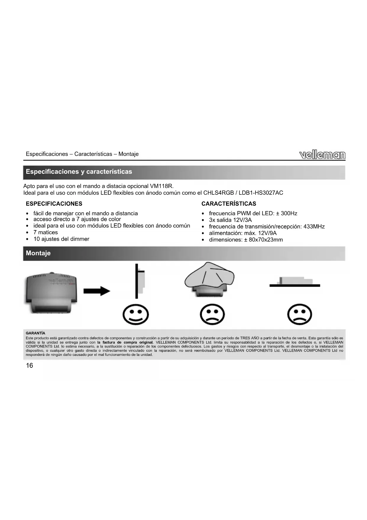 Eeste producto esta garantizado contra defecios de componentes y construccion a partir de su adquision y durante un periodo de TRES ANO a partir de la fecha de venta. Esta garantia sio es valida si la unidad seenta con la factura de compra original. VELLEMAN COMPONENTS Ltd. limita su responsabildad a la reparacion de los defectos o, si VELLEMAN COMPONENTS Ltd. lo estima necessario, a la sustitucion o reparacion de los componentes defectuos Los gastos y riesgos con respecto al transporte, el desmontaje o la instalacion del dispositivo, o qualier other gasto directa or indirectamente vinculado con la reparacion, no sera reembolsado por VELLEMAN COMPONENTS Ltd. VELLEMAN COMPONENTS Ltd no responderde ningen daño causado por el mal funconaciondo la unidad.