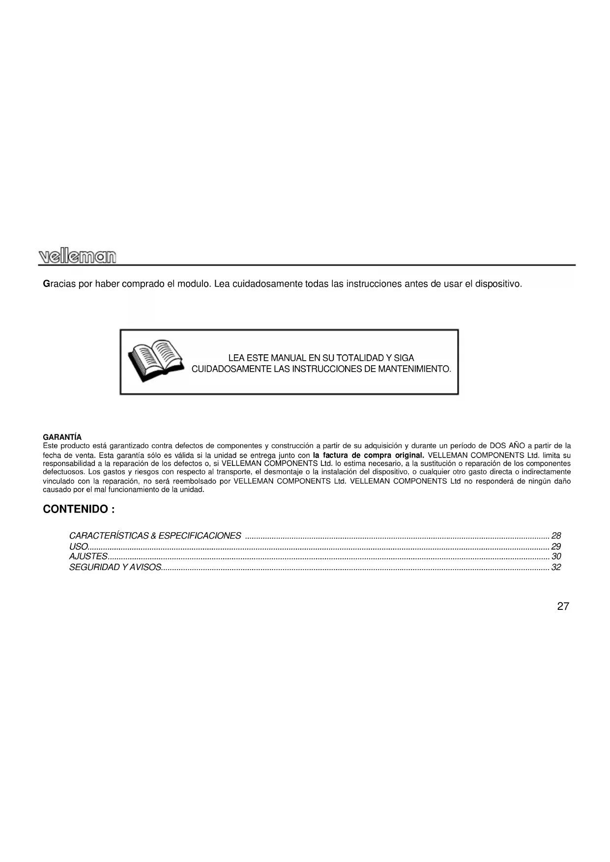 GARANTÍA Este producto está garantizado contra defectos de componentes y construcción a partir de su adquisición y durante un período de DOS AÑO a partir de la fecha de venta. Esta garantía sólo es válida si la unidad se entrega junto con la factura de compra original. VELLEMAN COMPONENTS Ltd. limita su responsabilidad a la reparación de los defectos o, si VELLEMAN COMPONENTS Ltd. lo estima necesario, a la sustitución o reparación de los componentes defectuosos. Los gastos y riesgos con respecto al transporte, el desmontaje o la instalación del dispositivo, o cualquier otro gasto directa o indirectamente vinculado con la reparación, no será reembolsado por VELLEMAN COMPONENTS Ltd. VELLEMAN COMPONENTS Ltd no responderá de ningún daño causado por el mal funcionamiento de la unidad. CONTENIDO :