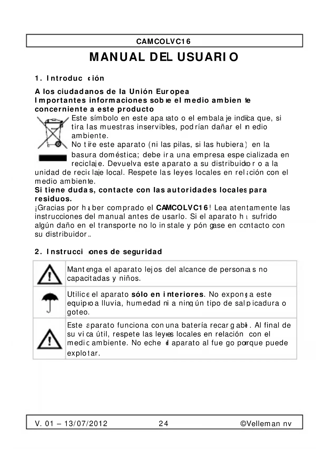 Descarga las instrucciones para tu Videocámara en formato PDF gratis! Encuentra tus instrucciones CAMCOLVC16 - VELLEMAN y toma tu dispositivo electrónico nuevamente en la mano. En esta página están publicados todos los documentos necesarios para el uso de su dispositivo. CAMCOLVC16 de la marca VELLEMAN.