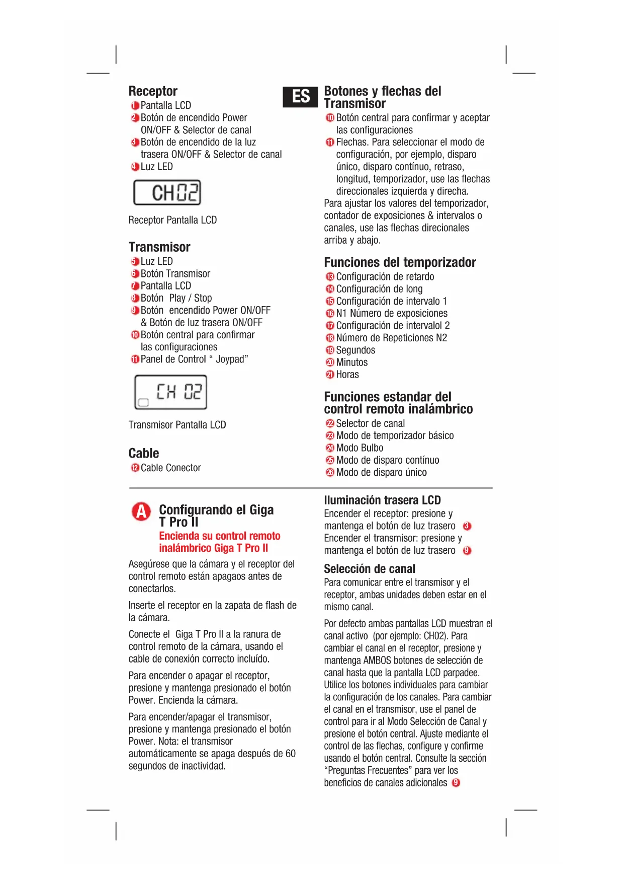 14Receptor Pantalla LCD Botón de encendido Power ON/OFF & Selector de canalBotón de encendido de la luz trasera ON/OFF & Selector de canalLuz LEDReceptor Pantalla LCD Transmisor Luz LEDBotón TransmisorPantalla LCDBotón Play / Stop Botón encendido Power ON/OFF & Botón de luz trasera ON/OFFBotón central para confirmar las configuracionesPanel de Control “ Joypad”Transmisor Pantalla LCD Cable Cable Conector Botones y flechas del Transmisor Botón central para confirmar y aceptarlas configuracionesFlechas. Para seleccionar el modo deconfiguración, por ejemplo, disparoúnico, disparo contínuo, retraso,longitud, temporizador, use las flechasdireccionales izquierda y direcha.Para ajustar los valores del temporizador,contador de exposiciones & intervalos ocanales, use las flechas direcionalesarriba y abajo. Funciones del temporizador Configuración de retardoConfiguración de longConfiguración de intervalo 1 N1 Número de exposiciones Configuración de intervalol 2Número de Repeticiones N2SegundosMinutosHoras Funciones estandar del control remoto inalámbrico Selector de canalModo de temporizador básicoModo BulboModo de disparo contínuoModo de disparo único