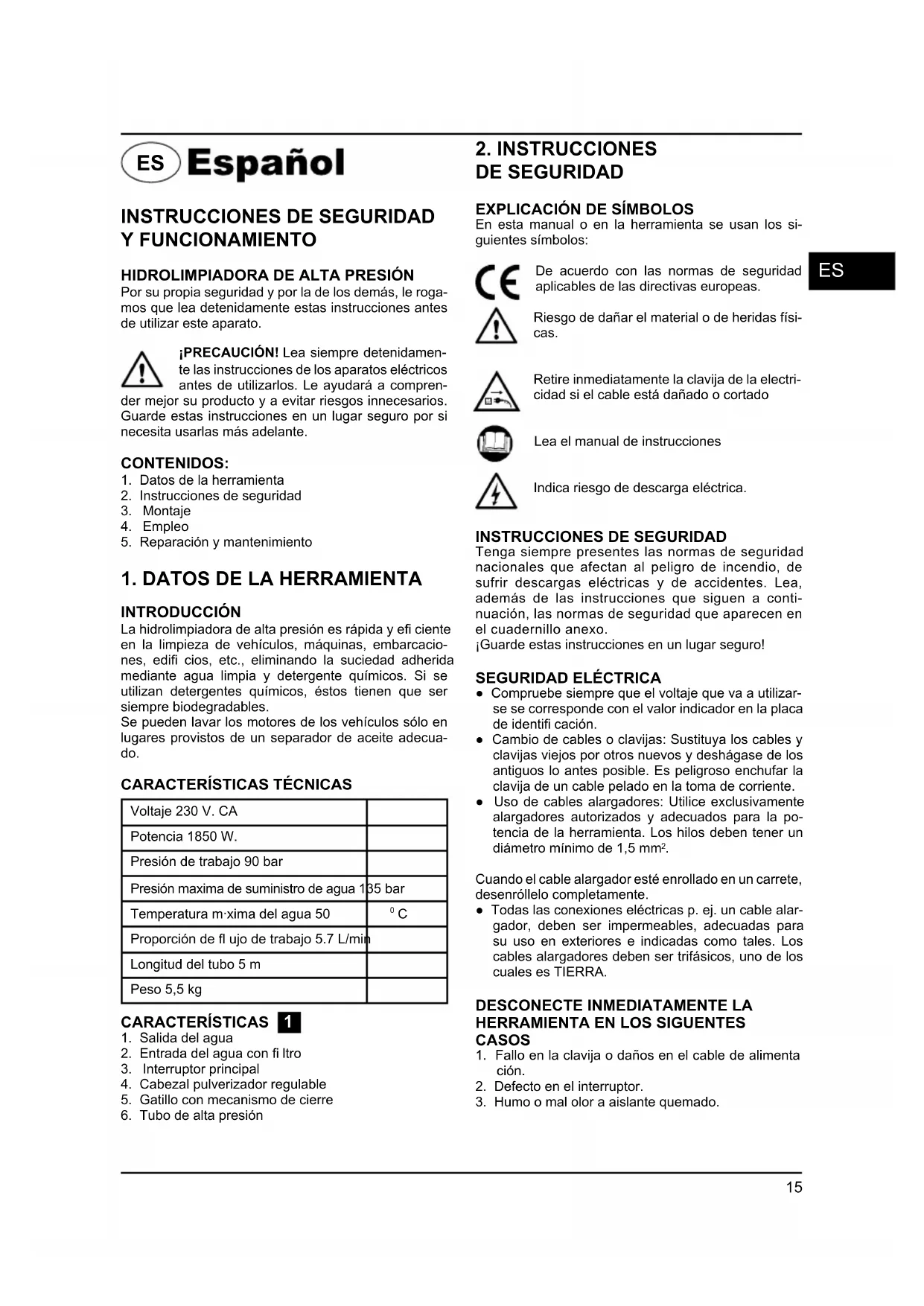 Voltaje 230 V. CA Potencia 1850 W. Presión de trabajo 90 bar Presión maxima de suministro de agua 135 bar Temperatura m·xima del agua 50