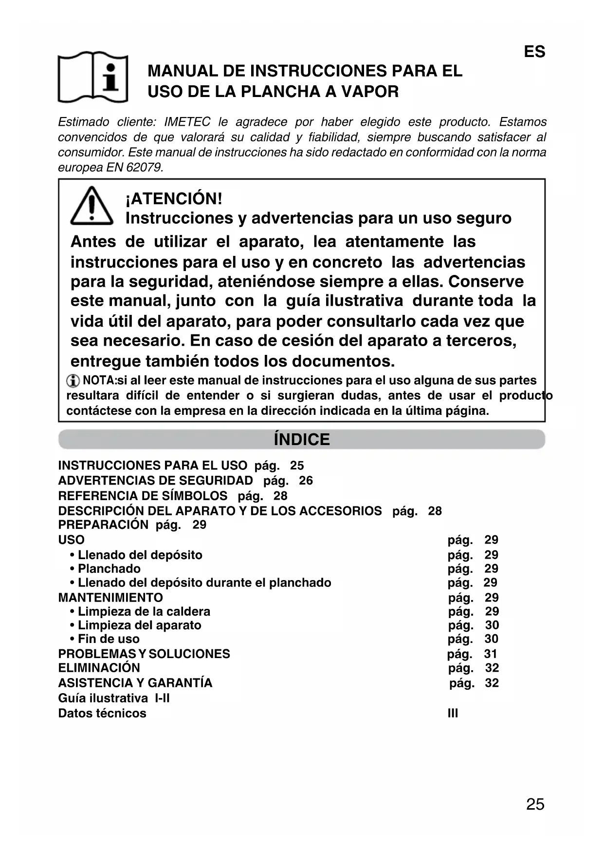 MANUAL DE INSTRUCCIONES PARA EL USO DE LA PLANCHA A VAPOR Estimado cliente: IMETEC le agradece por haber elegido este producto. Estamos