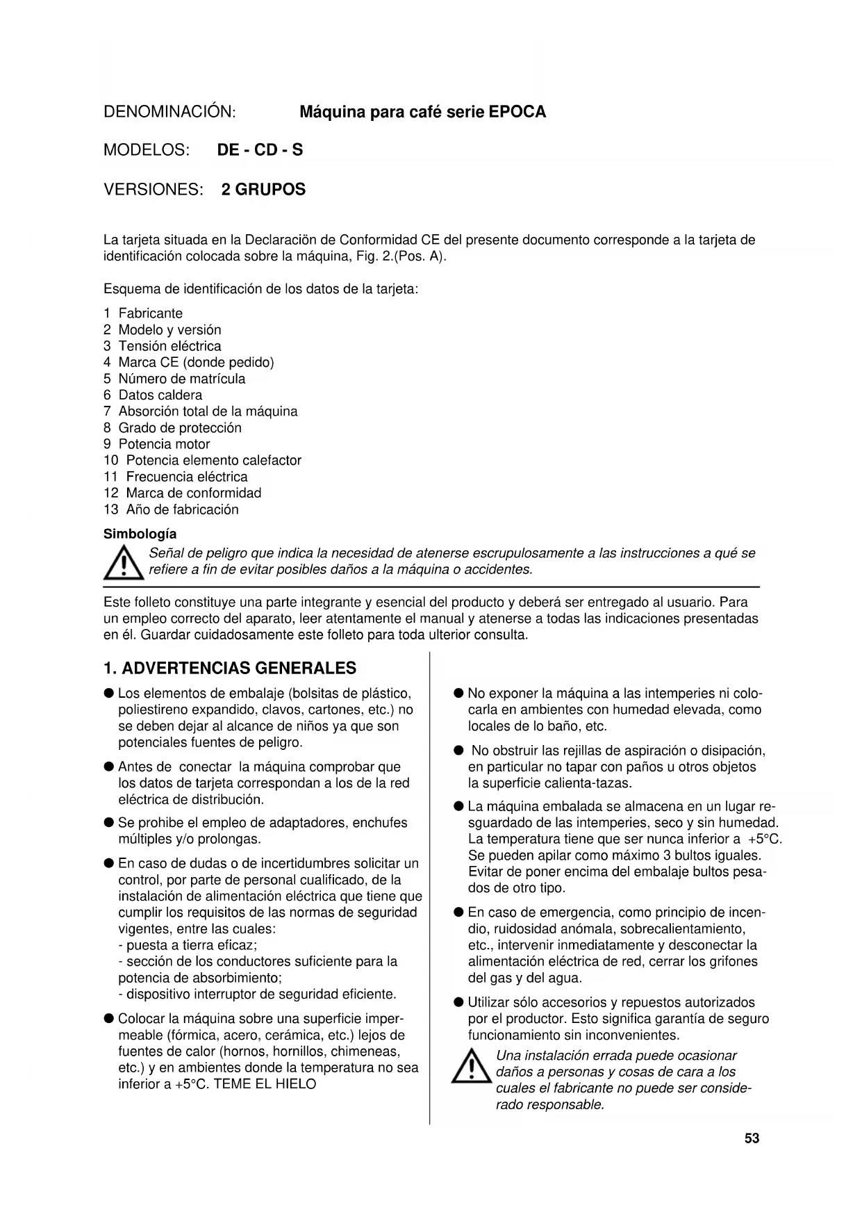 VERSIONES: 2 GRUPOS La tarjeta situada en la Declaraciön de Conformidad CE del presente documento corresponde a la tarjeta de identificación colocada sobre la máquina, Fig. 2.(Pos. A). Esquema de identificación de los datos de la tarjeta: Simbología Señal de peligro que indica la necesidad de atenerse escrupulosamente a las instrucciones a qué se refiere a fin de evitar posibles daños a la máquina o accidentes. Este folleto constituye una parte integrante y esencial del producto y deberá ser entregado al usuario. Para un empleo correcto del aparato, leer atentamente el manual y atenerse a todas las indicaciones presentadas en él. Guardar cuidadosamente este folleto para toda ulterior consulta. 1 Fabricante 2 Modelo y versión 3 Tensión eléctrica 4 Marca CE (donde pedido) 5 Número de matrícula 6 Datos caldera 7 Absorción total de la máquina 8 Grado de protección 9 Potencia motor 10 Potencia elemento calefactor 11 Frecuencia eléctrica 12 Marca de conformidad 13 Año de fabricación
