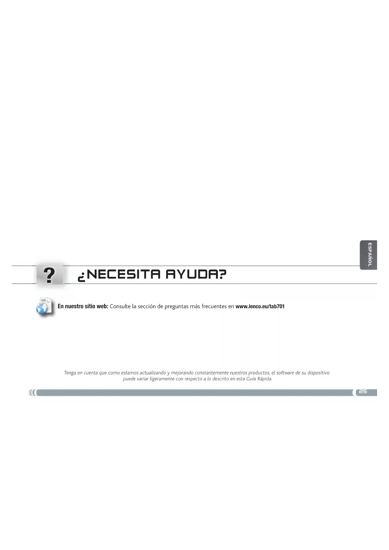 ¿NECESITA AYUDA? Tenga en cuenta que como estamos actualizando y mejorando constantemente nuestros productos, el software de su dispositivo puede variar ligeramente con respecto a lo descrito en esta Guía Rápida. En nuestro sitio web: Consulte la sección de preguntas más frecuentes en www.lenco.eu/tab70126