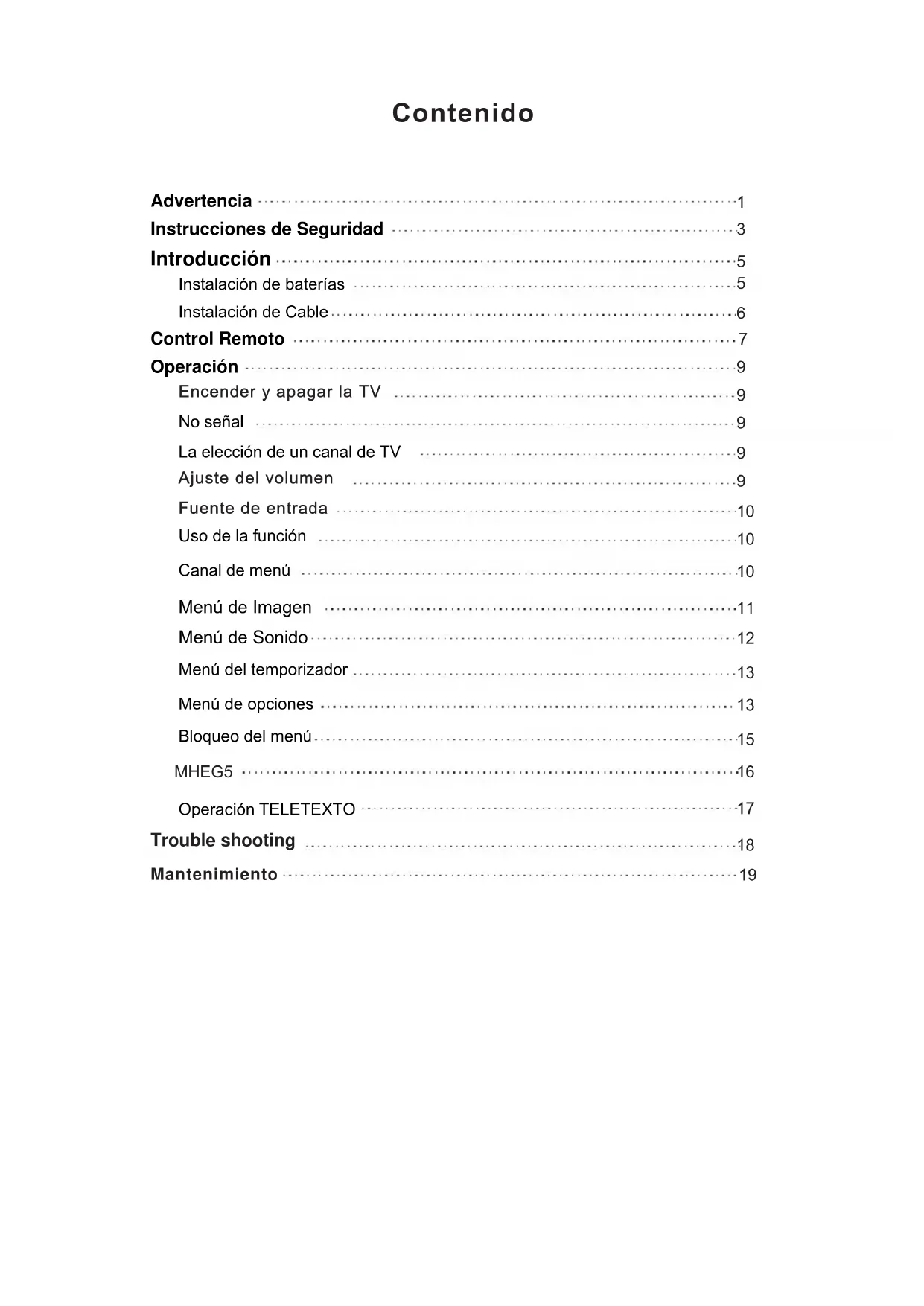 Contenido Advertencia Instrucciones de Seguridad Introducción Instalación de baterías Instalación de Cable Control Remoto Operación Encender y apagar la TV No señal La elección de un canal de TV Ajuste del volumen Fuente de entradaUso de la función