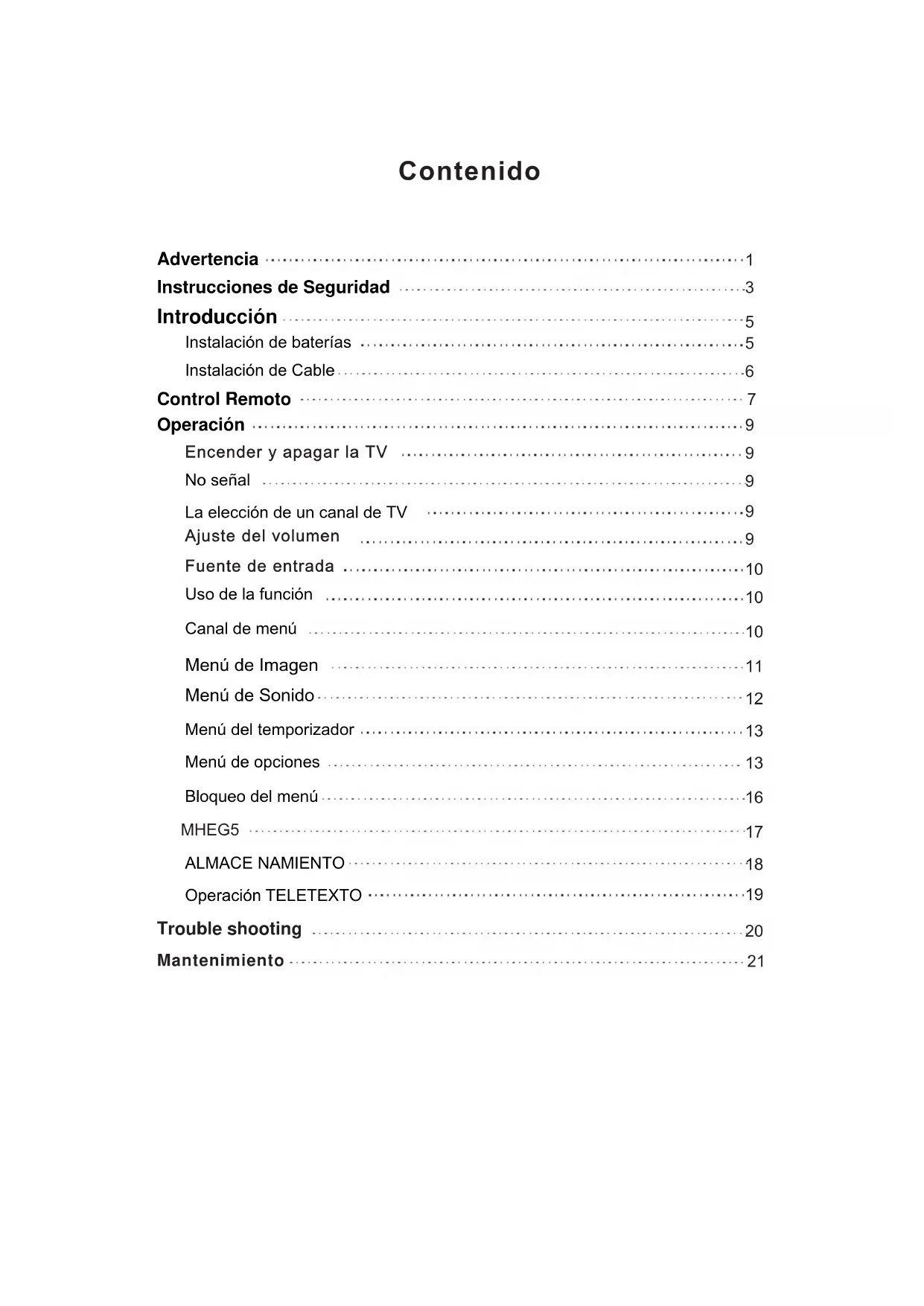 | No hay sonido y laImagen | -Compruebe si el enchufe principal se ha conectado a una pared de alquiler.-Compruebe si ha pulsado el botón POWER en el frente del广播电视.-Compruebe el contraste de laImagen y los ajustes de brillo. |