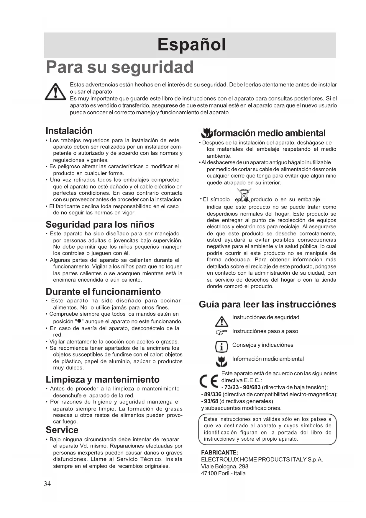 Para su seguridad Estas advertencias están hechas en el interés de su seguridad. Debe leerlas atentamente antes de instalaro usar el aparato.Es muy importante que guarde este libro de instrucciones con el aparato para consultas posteriores. Si elaparato es vendido o transferido, asegurese de que este manual esté en el aparato para que el nuevo usuariopueda conocer el correcto manejo y funcionamiento del aparato. Instalación • Los trabajos requeridos para la instalación de esteaparato deben ser realizados por un instalador com-petente o autorizado y de acuerdo con las normas yregulaciones vigentes.• Es peligroso alterar las características o modificar elproducto en cualquier forma.• Una vez retirados todos los embalajes compruebeque el aparato no esté dañado y el cable eléctrico enperfectas condiciones. En caso contrario contactecon su proveedor antes de proceder con la instalacion.• El fabricante declina toda responsabilidad en el casode no seguir las normas en vigor. Seguridad para los niños • Este aparato ha sido diseñado para ser manejadopor personas adultas o jovencitas bajo supervisión.No debe permitir que los niños pequeños manejenlos controles o jueguen con él.• Algunas partes del aparato se calientan durante elfuncionamento. Vigilar a los niños para que no toquenlas partes calientes o se acerquen mientras está laencimera encendida o aún caliente. Durante el funcionamiento • Este aparato ha sido diseñado para cocinaralimentos. No lo utilice jamás para otros fines.• Compruebe siempre que todos los mandos estén enposición " " aunque el aparato no este funcionando. • En caso de avería del aparato, desconéctelo de la red. • Vigilar atentamente la cocción con aceites o grasas.• Se recomienda tener apartados de la encimera losobjetos susceptibles de fundirse con el calor: objetosde plástico, papel de aluminio, azúcar o productosmuy dulces. Limpieza y mantenimiento • Antes de proceder a la limpieza o mantenimientodesenchufe el aparado de la red.• Por razones de higiene y seguridad mantenga elaparato siempre limpio. La formación de grasasresecas u otros restos de alimentos pueden provo-car fuego. Service • Bajo ninguna circunstancia debe intentar de repararel aparato Vd. mismo. Reparaciones efectuadas porpersonas inexpertas pueden causar daños o gravesdisfunciones. Llame al Servicio Técnico. Insistasiempre en el empleo de recambios originales. Información medio ambiental • Después de la instalación del aparato, deshágase delos materiales del embalaje respetando el medioambiente.• Al deshacerse de un aparato antiguo hágalo inutilizablepor medio de cortar su cable de alimentación desmontecualquier cierre que tenga para evitar que algún niñoquede atrapado en su interior. • El símbolo en el producto o en su embalaje indica que este producto no se puede tratar comodesperdicios normales del hogar. Este producto sedebe entregar al punto de recolección de equiposeléctricos y electrónicos para reciclaje. Al asegurarsede que este producto se deseche correctamente,usted ayudará a evitar posibles consecuenciasnegativas para el ambiente y la salud pública, lo cualpodría ocurrir si este producto no se manipula deforma adecuada. Para obtener información másdetallada sobre el reciclaje de este producto, póngaseen contacto con la administración de su ciudad, consu servicio de desechos del hogar o con la tiendadonde compró el producto.Este aparato está de acuerdo con las siguientesdirectiva E.E.C.: - 73/23 - 90/683 (directiva de baja tensión); - 89/336 (directiva de compatibilitad electro-magnetica);- 93/68 (directivas generales)y subsecuentes modificaciones. Guía para leer las instrucciónes Instrucciónes de seguridadInstrucciónes paso a pasoConsejos y indicaciónesInformación medio ambiental FABRICANTE:ELECTROLUX HOME PRODUCTS ITALY S.p.A.Viale Bologna, 29847100 Forlì - ItaliaEstas instrucciones son válidas sólo en los países aque va destinado el aparato y cuyos símbolos deidentificación figuran en la portada del libro deinstrucciones y sobre el propio aparato. Español35