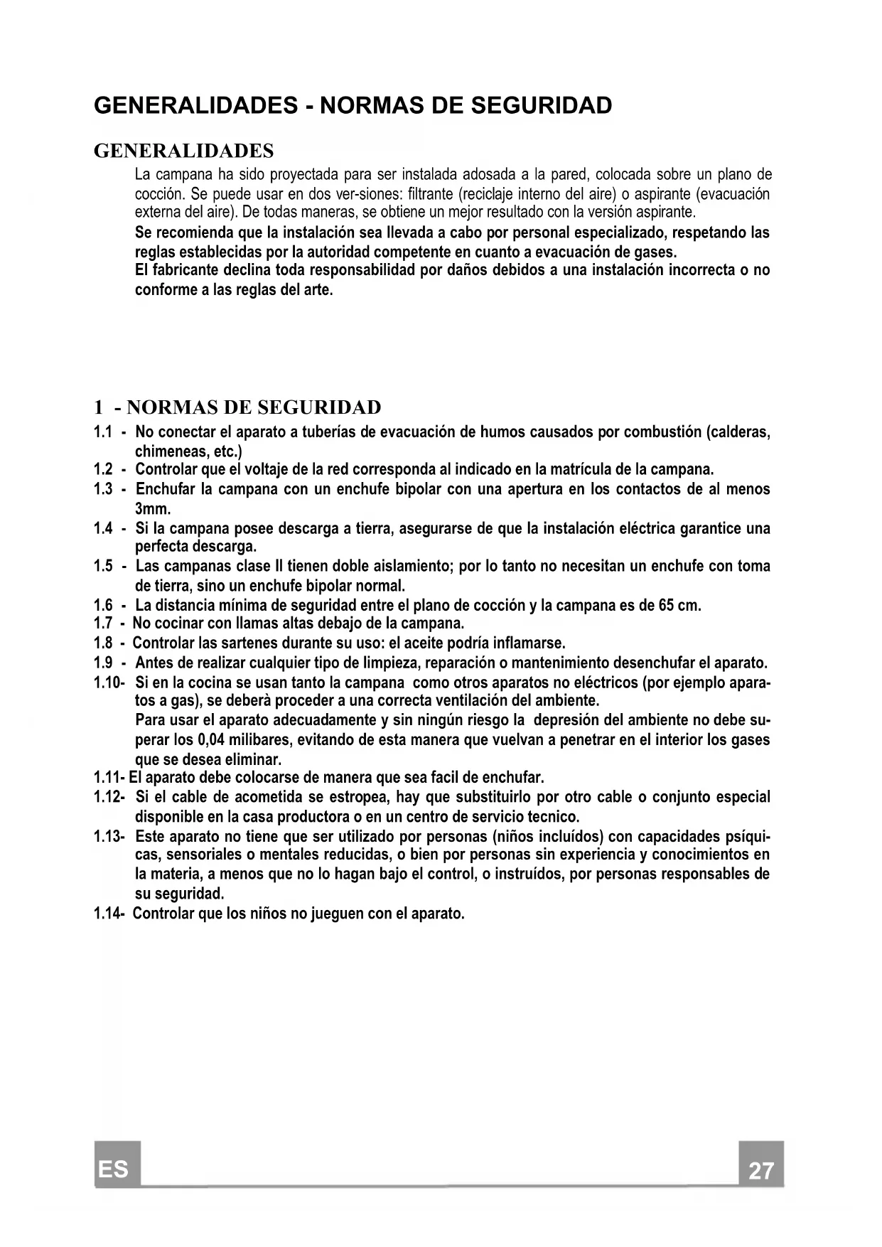 GENERALIDADES - NORMAS DE SEGURIDAD GENERALIDADES La campana ha sido proyectada para ser instalada adosada a la pared, colocada sobre un plano de