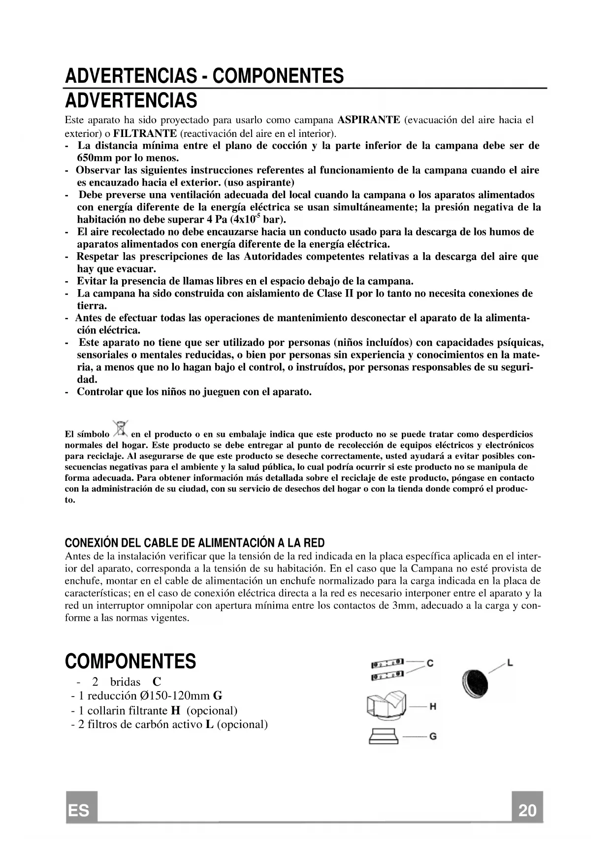 ADVERTENCIAS - COMPONENTES ADVERTENCIAS Este aparato ha sido proyectado para usarlo como campana ASPIRANTE (evacuación del aire hacia el