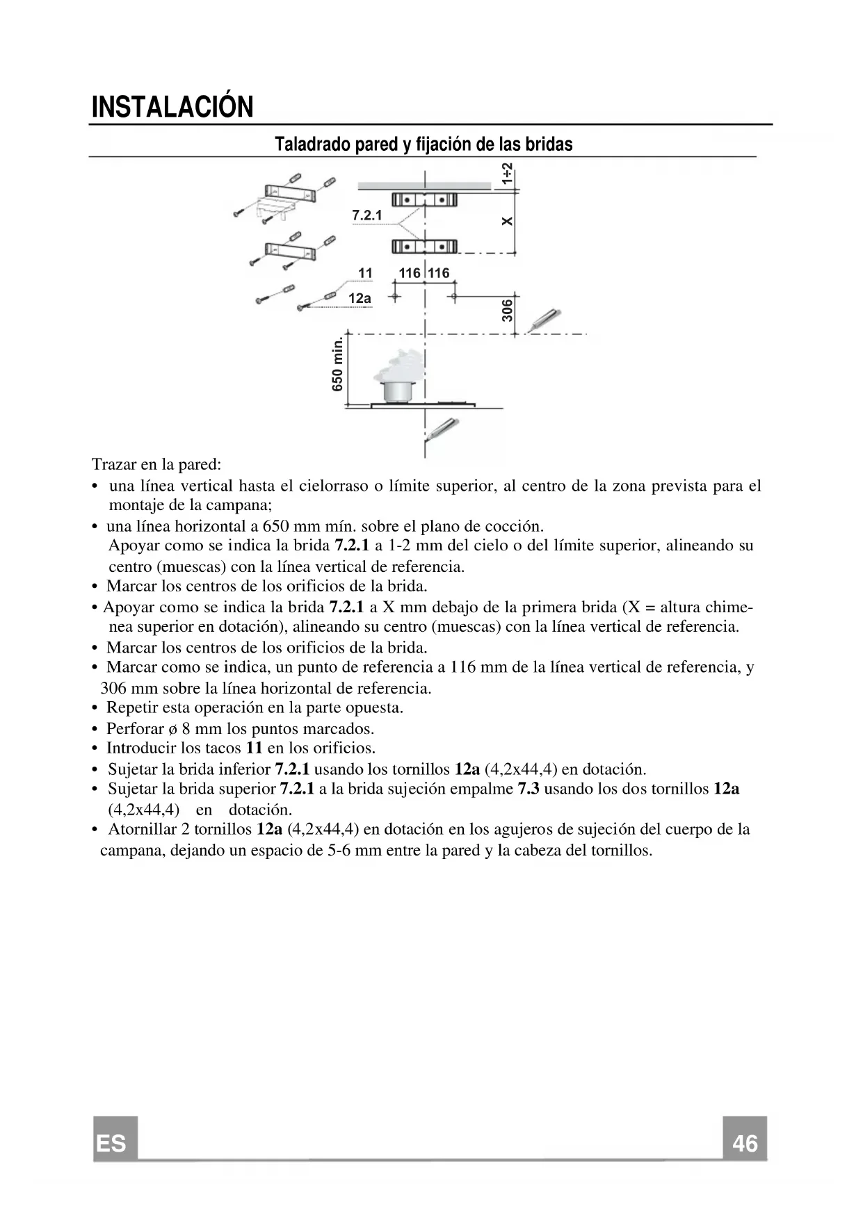 campana, dejando un espacio de 5-6 mm entre la pared y la cabeza del tornillos.ES