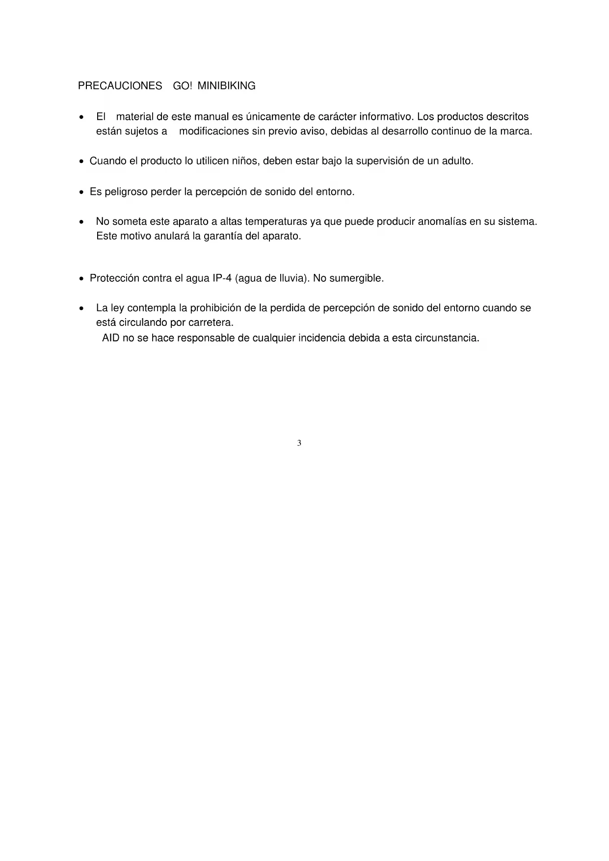 - La ley contempla la prohibición de la perdida de percepción de sonido del entorno cuando se está circulando por carretera. AID no se hace responsable de cualquier incidencia debida a esta circunstancia.4 Manual de Usuario El reproductor portátil MP3 Minibiking emite un sonido claro y natural con distintos niveles, y sólo con la palma de su mano. El envase de producto incluye lo siguiente: - El reproductor musical portátil MP3 Minibiking - Cable USB/3.5 mm. - Soporte que se fija al manillar - Bolsa protectora