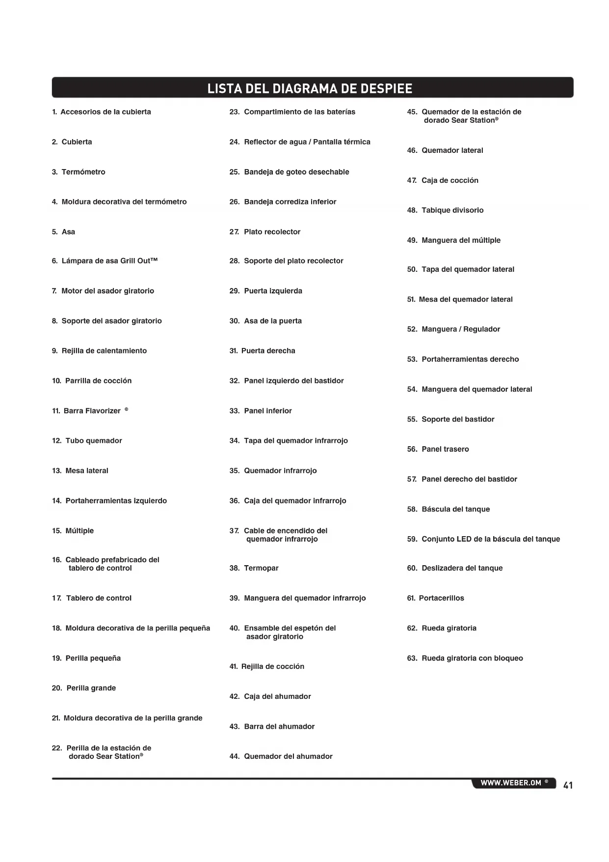 recubiertas con una capa gruesa de grasa quemada? Límpielas a fondo. (Vea la sección “LIMPIEZA”.) ¿Estálabandejadelfondo“sucia”ynodejaquela grasa fluya al plato recolector? Limpielabandejadelfondo. El quemador produce llamas con un patrón errático. La llama se mantiene baja cuando el quemador está en fuego alto. Las llamas no corren a lo largo de todo el tubo del quemador. ¿Están limpios los quemadores? Limpie los quemadores. (Vea la sección de “MANTENIMIENTO”.) La parte interna de la tapa pareciera estar “pelándose”. (Se parece al desprendimiento de pintura.) La tapa está porcelanizada o es de acero inoxidable y no está pintada. No puede “pelarse”. Lo que está viendo es grasa asada que se ha convertido en carbón y se está descascarando. ESTO NO ES UN DEFECTO. Límpiela a fondo. (Vea la sección “LIMPIEZA”.) Las puertas del gabinete no están alineadas. Reviseelpernodeajusteenlaparteinferiorde cada puerta. Aflojela(s)tuerca(s)deajuste.Deslicela(s)puerta(s)hastaquedar alineada(s.) Apriete la tuerca. Si los problemas no pueden corregirse usando cualquiera de estos métodos, por favor contacte al Representante de Atención al Cliente en su área usando la información de contacto en nuestro sitio web. Conéctese a www.weber.com