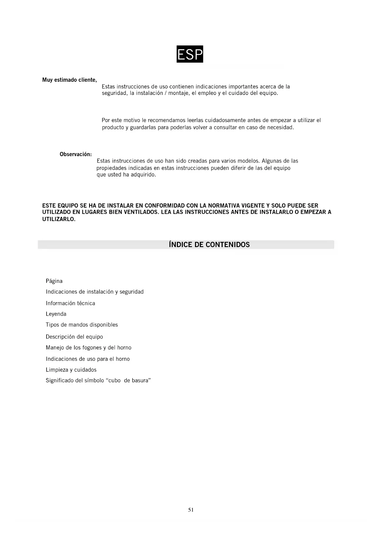 Página Indicaciones de instalación y seguridad Información técnica Leyenda Tipos de mandos disponibles Descripción del equipo Manejo de los fogones y del horno Indicaciones de uso para el horno Limpieza y cuidados Significado del símbolo “cubo de basura”