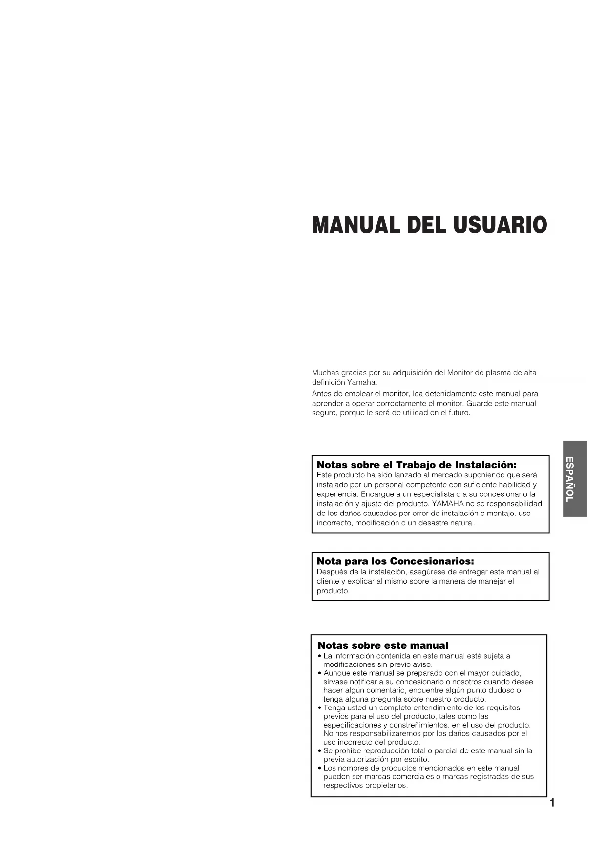 Muchas gracias por su adquisición del Monitor de plasma de alta definición Yamaha. Antes de emplear el monitor, lea detenidamente este manual para aprender a operar correctamente el monitor. Guarde este manual seguro, porque le será de utilidad en el futuro. Notas sobre el Trabajo de Instalación: Este producto ha sido lanzado al mercado suponiendo que será instalado por un personal competente con suficiente habilidad y experiencia. Encargue a un especialista o a su concesionario la instalación y ajuste del producto. YAMAHA no se responsabilidad de los daños causados por error de instalación o montaje, uso incorrecto, modificación o un desastre natural. Nota para los Concesionarios: Después de la instalación, asegúrese de entregar este manual al cliente y explicar al mismo sobre la manera de manejar el producto. Notas sobre este manual