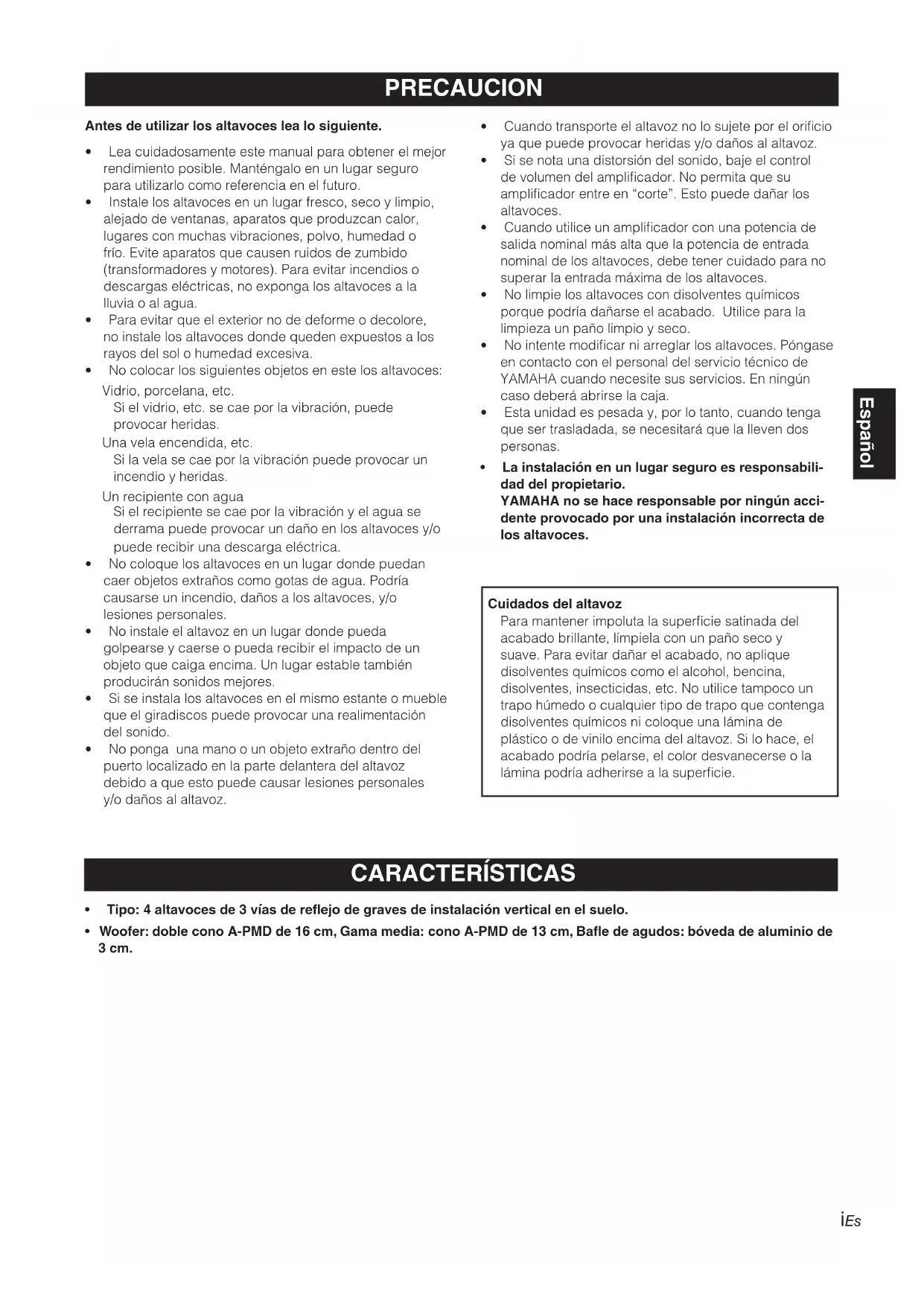 - La instalación en un lugar seguro es responsabili- dad del propietario. YAMAHA no se hace responsable por ningún acci- dente provocado por una instalación incorrecta de los altavoces. CARACTERÍSTICAS
