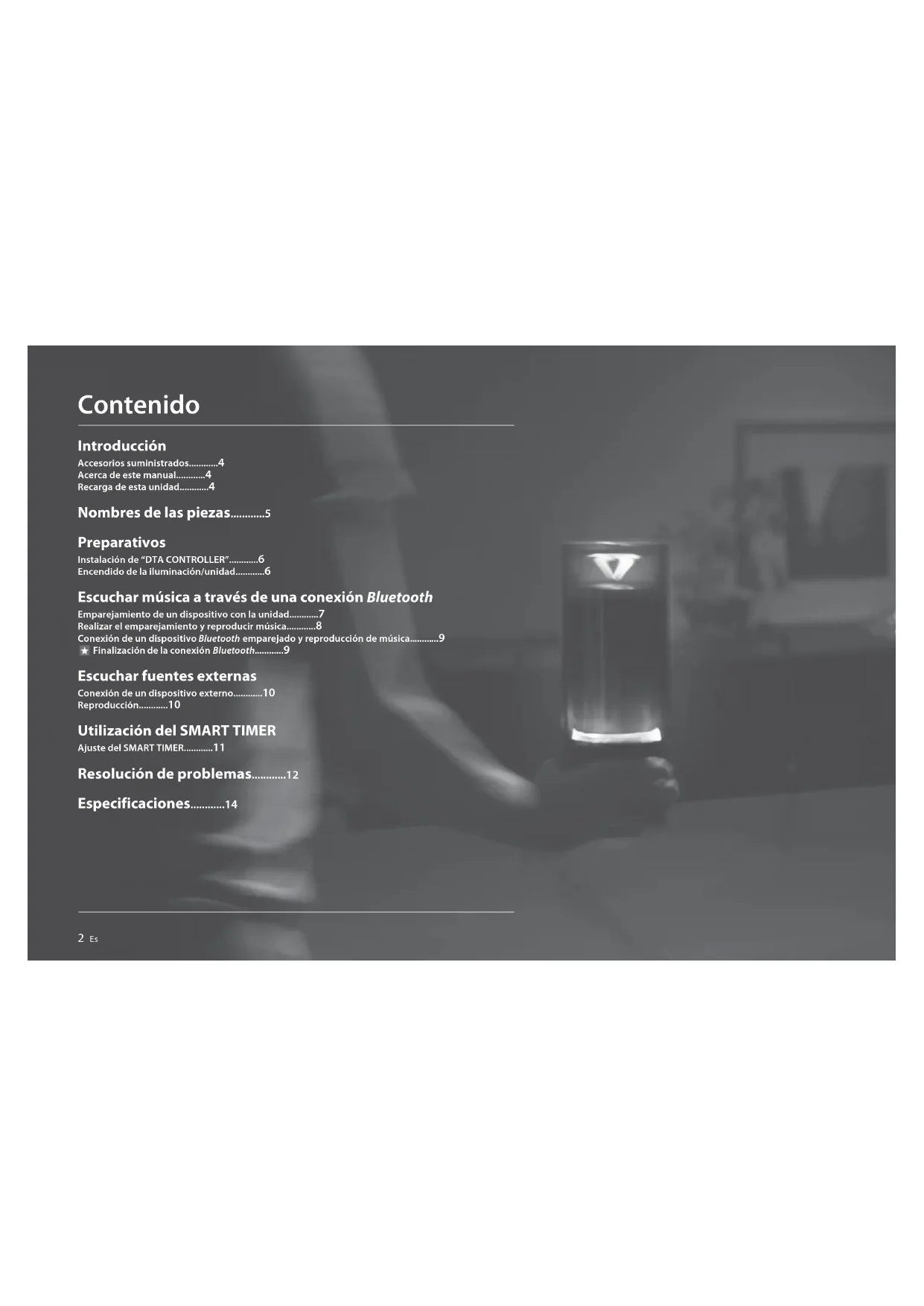 • Asegúrese de sincronizar el SMART TIMER con la unidad cada vez que configure el SMART TIMER. Temporizador de activación Temporizador de apagado• Encender la iluminación a una hora definida.• Definir el brillo de la iluminación.• Reproducir la música de un dispositivo conectado a una hora especificada.• Especificar una canción.• Predefinir el nivel de volumen.• Apagar la iluminación a una hora definida.• Apagar la alimentación a una hora definida. A causa de las mejoras introducidas en los productos, las especificaciones y el aspecto están sujetos a cambios sin previo aviso. • Para reproducir una canción a través de una conexión Bluetooth a una hora concreta, la función Bluetooth del smartphone o la tableta tiene que estar activada. Además, en el caso del iPhone, no cierre DTA CONTROLLER al realizar acciones multitarea. • Si hay otro dispositivo Bluetooth conectado a la unidad a la hora definida, la canción seleccionada para el temporizador de activación no se reproducirá. Desconecte cualquier otro dispositivo antes de la hora ajustada.• El temporizador de activación y el temporizador de apagado del SMART TIMER pueden activarse y desactivarse únicamente desde DTA CONTROLLER.Reloj interno de la unidad• La unidad copia la hora al reloj interno de la unidad desde DTA CONTROLLER si un dispositivo se conecta a la unidad a través de una conexión Bluetooth. El SMART TIMER se rige por el reloj interno de la unidad.• Si desconecta el adaptador de CA y se agota completamente la batería, se restablecerá el ajuste del reloj y se apagará el SMART TIMER.12 Es