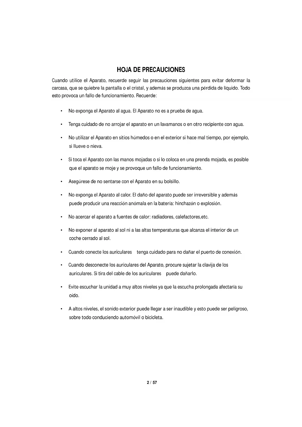 - No exponga el Aparato al calor. El daño del aparato puede ser irreversible y además puede producir una reacción anómala en la batería: hinchazón o explosión.