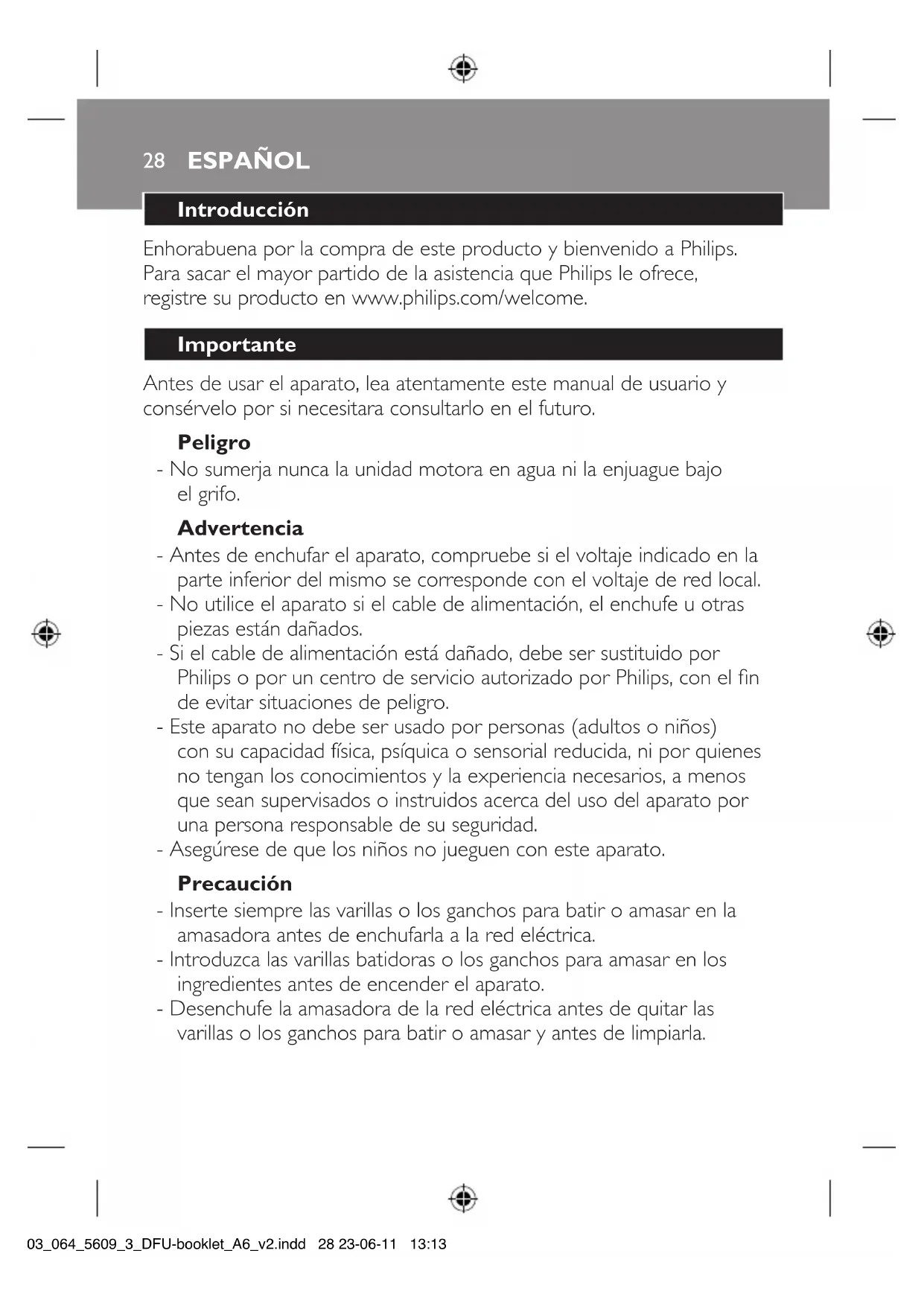 4203_064_5609_3_DFU-booklet_A6_v2.indd 28 23-06-11 13:13- No utilice nunca accesorios o piezas de otros fabricantes o que no