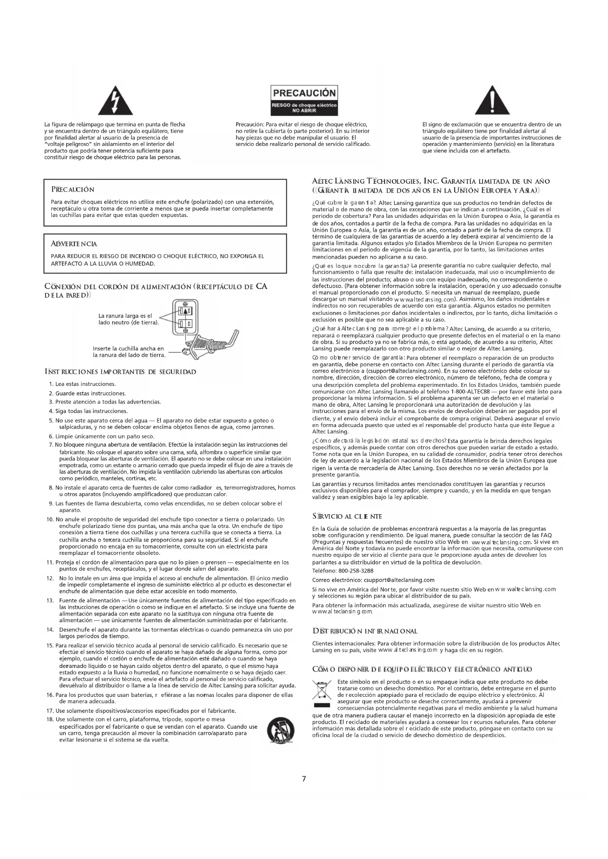 devuélvalo al distribuidor o llame a la línea de servicio de Altec Lansing para solicitar ayuda.