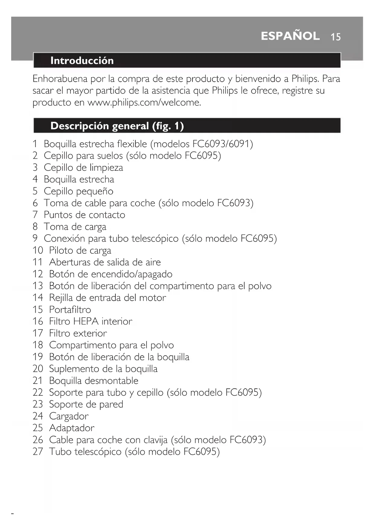 ENGLISH 13Removing the battery pack NiMHbatterypacksmayexplodeifexposedtohightemperaturesor re. Only remove the battery pack if it is completely empty. Remove the battery pack in the following way: 1 Let the appliance run until it stops. 2 Loosen and remove the screws. Open the vacuum cleaner (Fig. 30). 3 Cut the connecting wires one by one and remove the battery pack (Fig. 31). Saving energy If you are not going to use the appliance for a longer period of time, we advise you to remove the adapter from the wall socket to save energy. Guarantee & service If you need information or if you have a problem, please visit the Philips website at www.philips.com or contact the Philips Customer Care Centre in your country (you nd its phone number in the worldwide guarantee leaet). If there is no Customer Care Centre in your country, go to your local Philips dealer or contact the Service Department of Philips Domestic Appliances and Personal Care BV. ENGLISH1415 Introducción Enhorabuena por la compra de este producto y bienvenido a Philips. Para sacar el mayor partido de la asistencia que Philips le ofrece, registre su producto en www.philips.com/welcome. Descripción general (g. 1) 1 Boquilla estrecha exible (modelos FC6093/6091) 2 Cepillo para suelos (sólo modelo FC6095) 3 Cepillo de limpieza 4 Boquilla estrecha 5 Cepillo pequeño 6 Toma de cable para coche (sólo modelo FC6093) 7 Puntos de contacto 8 Toma de carga 9 Conexión para tubo telescópico (sólo modelo FC6095) 10 Piloto de carga 11 Aberturas de salida de aire 12 Botón de encendido/apagado 13 Botón de liberación del compartimento para el polvo 14 Rejilla de entrada del motor 15 Portaltro 16 Filtro HEPA interior 17 Filtro exterior 18 Compartimento para el polvo 19 Botón de liberación de la boquilla 20 Suplemento de la boquilla 21 Boquilla desmontable 22 Soporte para tubo y cepillo (sólo modelo FC6095) 23 Soporte de pared 24 Cargador 25 Adaptador 26 Cable para coche con clavija (sólo modelo FC6093) 27 Tubo telescópico (sólo modelo FC6095) ESPAÑOLImportante Antes de usar el aparato, lea atentamente este manual de usuario y consérvelo por si necesitara consultarlo en el futuro. Peligro No aspire nunca agua ni ningún otro líquido. No aspire nunca sustancias inamables ni cenizas hasta que éstas estén frías. No sumerja nunca el aspirador, el cargador ni el adaptador en agua ni en ningún otro líquido. Advertencia Antes de enchufar el aparato, compruebe si el voltaje indicado en el mismo se corresponde con el voltaje de red local. No utilice el aspirador, el cargador ni el adaptador si están dañados. No utilice el aparato si tiene algún fallo o deterioro. Llévelo a un servicio de asistencia técnica autorizado por Philips para su reparación. Si el adaptador o el cargador están dañados, sustitúyalos siempre por otros del modelo original para evitar situaciones de peligro. Sólo modelo FC6093: si el cable para coche o su clavija están dañados, deje de utilizarlos y sustitúyalos por unos del modelo original. Este aparato no debe ser usado por personas (adultos o niños) con su capacidad física, psíquica o sensorial reducida, ni por quienes no tengan los conocimientos y la experiencia necesarios, a menos que sean supervisados o instruidos acerca del uso del aparato por una persona responsable de su seguridad. Asegúrese de que los niños no jueguen con este aparato. Precaución Antes de limpiar el cargador, desenchufe el adaptador de la toma de corriente. Cargue el aspirador únicamente con el adaptador y el cargador suministrados. Durante la carga el adaptador se calienta. Esto es normal. Apague siempre el aspirador después de usarlo.